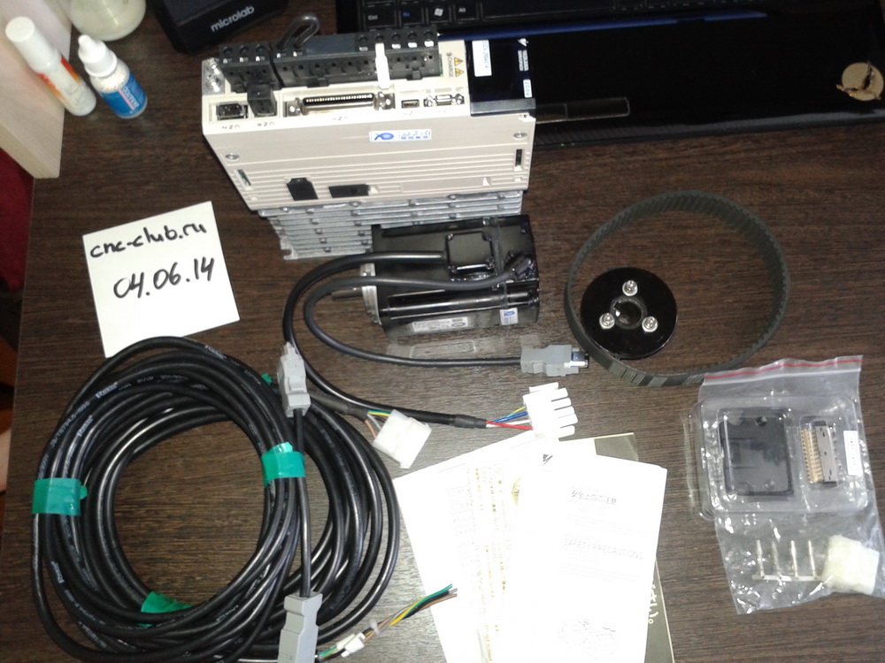 В комплекте драйвер, двигатель, два кабеля и разьемы, как бонус шкив и ремень к нему с аналогичного мотора.