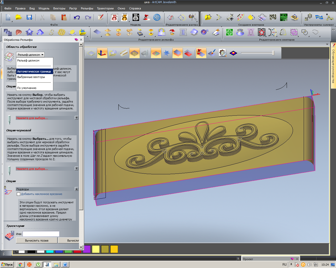А кто мешает нарисовать вектора в нужных местах и задать обработку между ними?cartura писал(а):В арткаме сделал модель, в центре узор, по краям модели скосы. Центральный узор обрабатываю путем обработки по "выбранным векторам", но скосы не получается охватить потому, что они построены вытягиванием по двум направляющим. Здесь я нашел только выход выбирать в области обработки "рельеф целиком". Но тогда фреза будет всю поверхность обрабатывать, а мне только центральный узор сделать и скосы. Можно ли скосы также отдельно сделать, как и центральный узор, не затрагиваю остальную площадь.