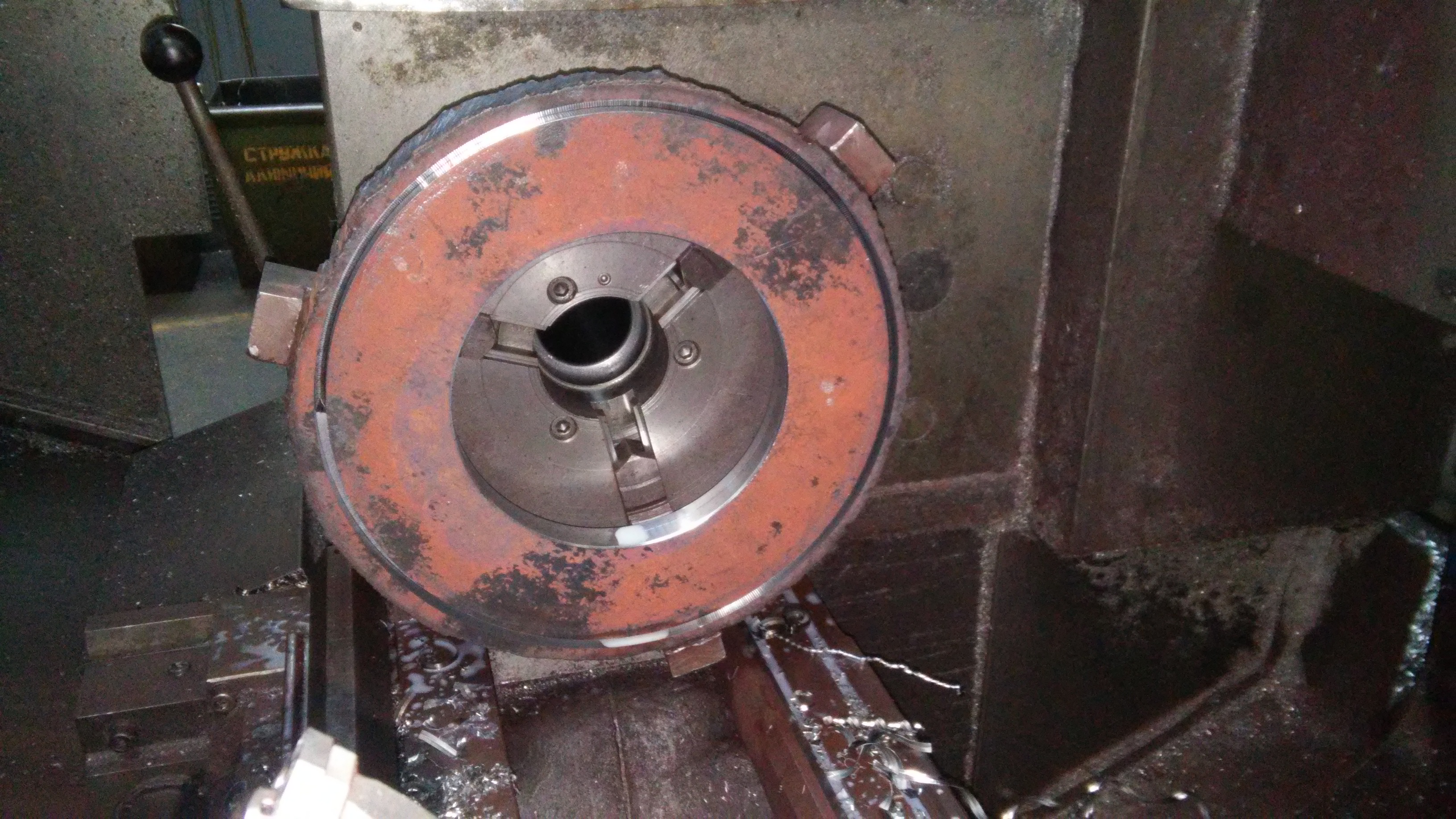 16К20Ф3. Заготовка - блин вырезанный автогеном из листа стали. Диаметр блина 300 мм, толщина 20 мм. Зажимают в трехкулачковом патроне. Делают операции: в центре подчищают радиус 100 мм. И делают габарит по радиусу 250мм., Габарит делают торцевым точением отрезным инструментом. При этом стоит страшный звон и скрип, пробовали менять подачи и обороты, переписывали программу под два диапазона. На втором ломает резец, на третьем останавливает шпиндель.
