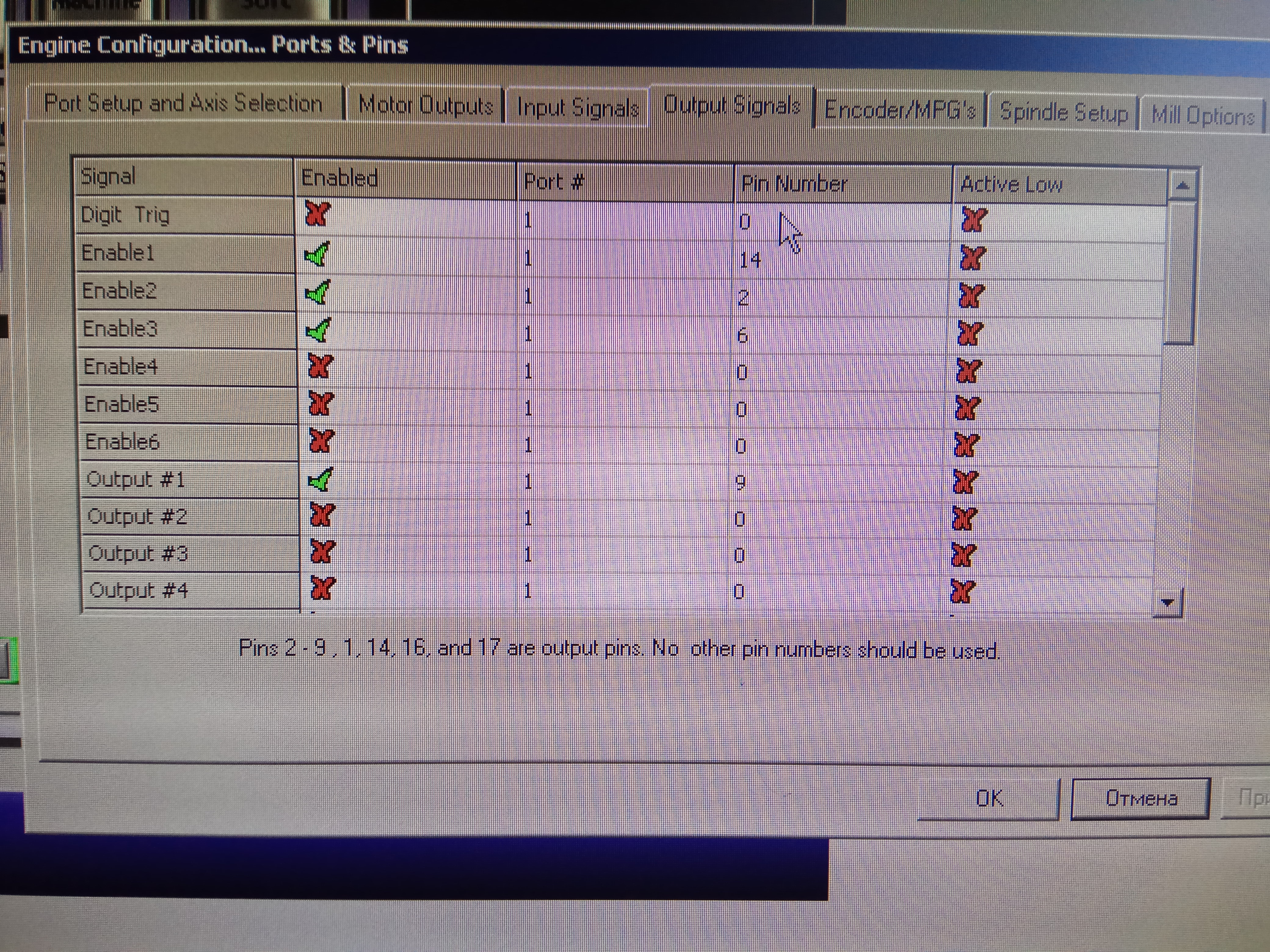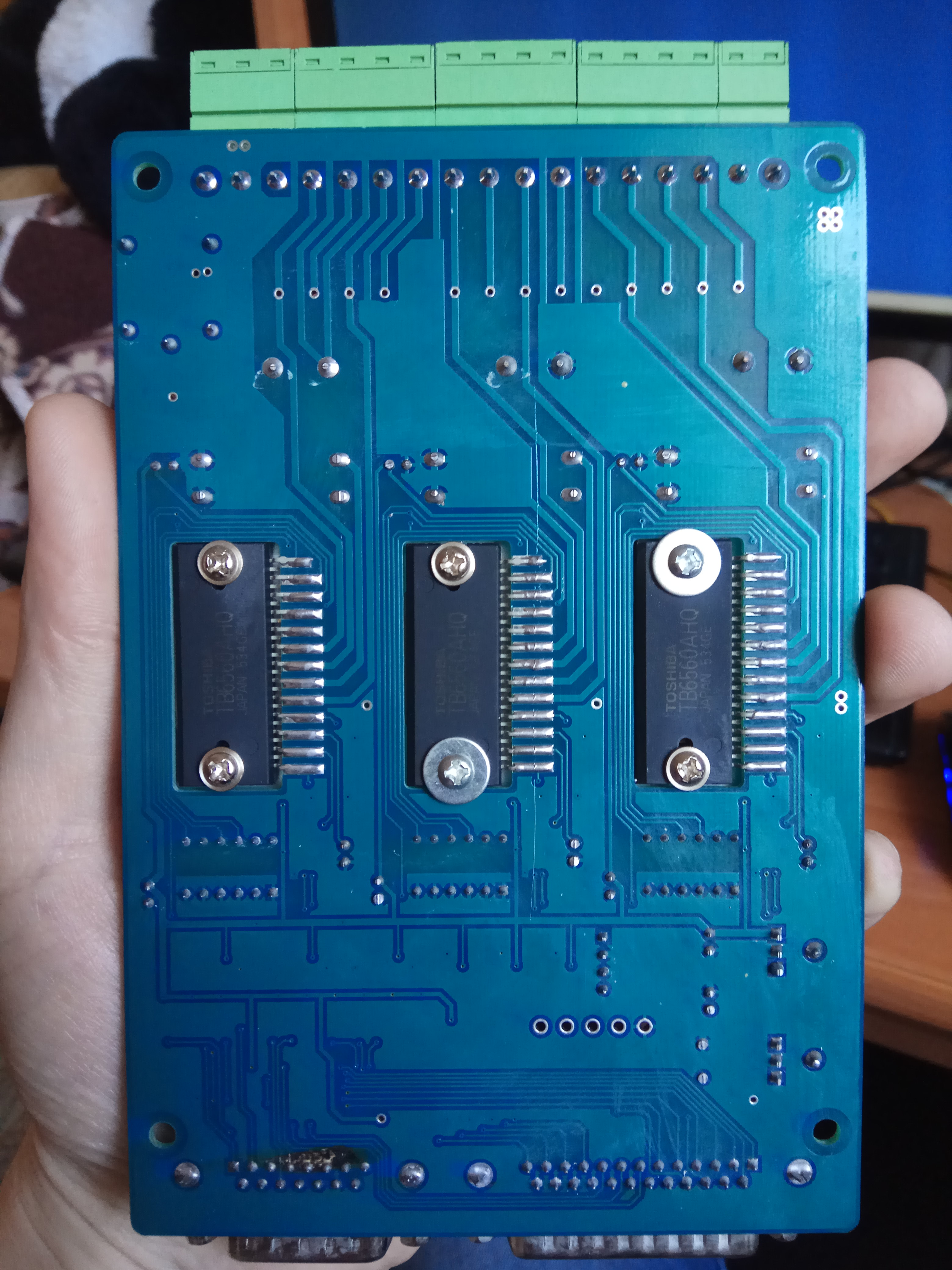 Вообщем на плате есть косяки в виде подгорания верхнего слоя текстолита возле мануал разъема (дорожки не повреждены, контакты есть, прозванивал) и продольного поверхностного пореза по центру платы - натаможне ножи острые :pssdoff: (также контакты не повреждены, все прозвонил, так что на это не обращайте внимания). С лпт разъема сигнал до всех осей доходит - горят\мигают светодиоды PUL при ручном движении осей в матч3 и при пробной программе фрезеровки. Все 3 движка при нажатии кнопки RESET начинают пищать. Пины в настройке матч3 вбивал строго по инструкции от продавца.
