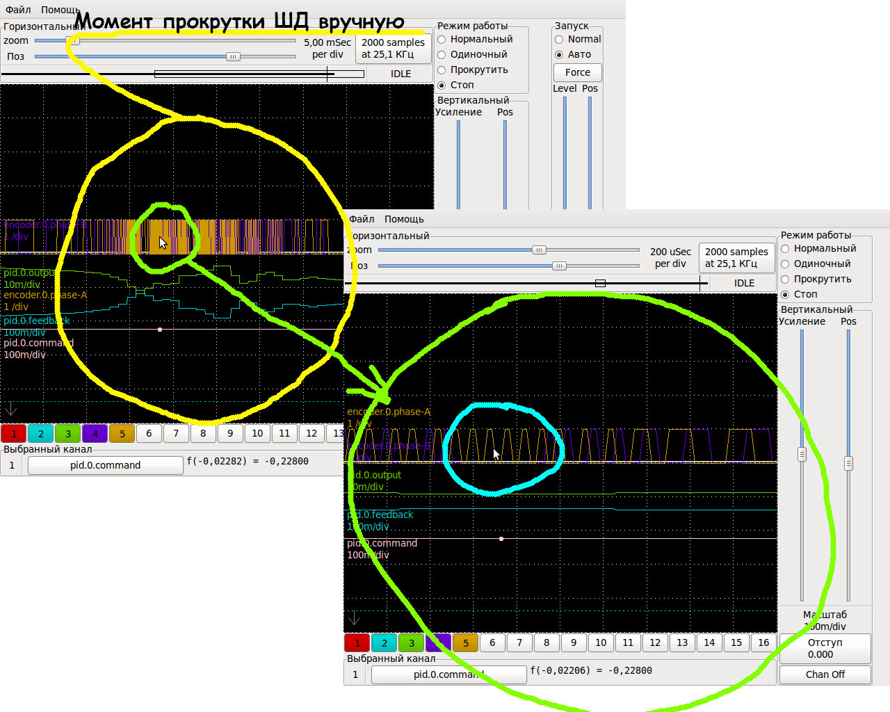 После долгих мучений было выяснено, что проворот не видит энкодер. Сначала решил, что провернул вал на движке. Разобрал: всё на месте. Собрал. Вечерок поразбирался с HAL-скопом. Разобрался. Сигнал с датчика на момент движения двигателя ровный, а на момент проворота руками с датчика идёт какая-то лажа. Разбираюсь дальше.