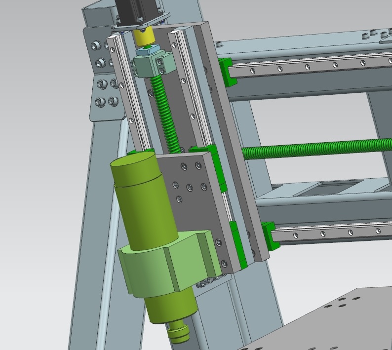 Я бы крепление шпинделя поднял выше и расположил между 2-х кареток. Тем самым распределив нагрузку равномернее.