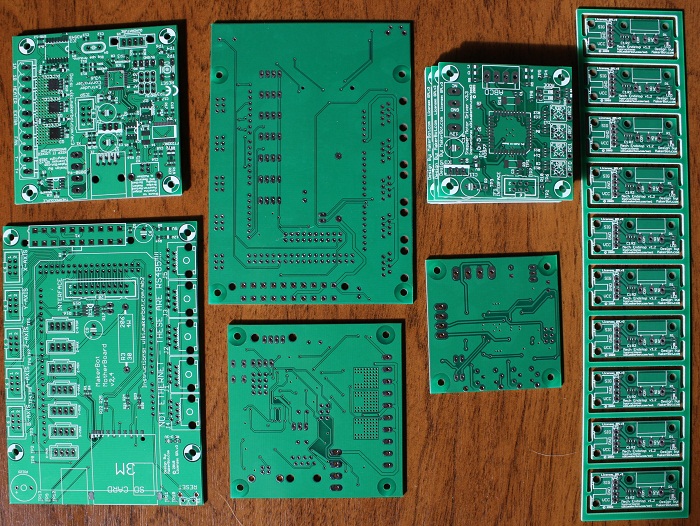 Вот что у меня получается на коленках :D Строго не судите, первый раз вытравил плату в конце января, до этого даже не видел как это делается. Зато эти платы с металлизацией отверстий. И никогда не покупайте паяльную маску (зеленую краску для плат) на ebay - там правильной паяльной маски нет (на фото как-раз та неправильная маска). В апреле придут качественные материалы и я доделаю ЧПУ сверлилку, тогда опишу подроно че к чему.