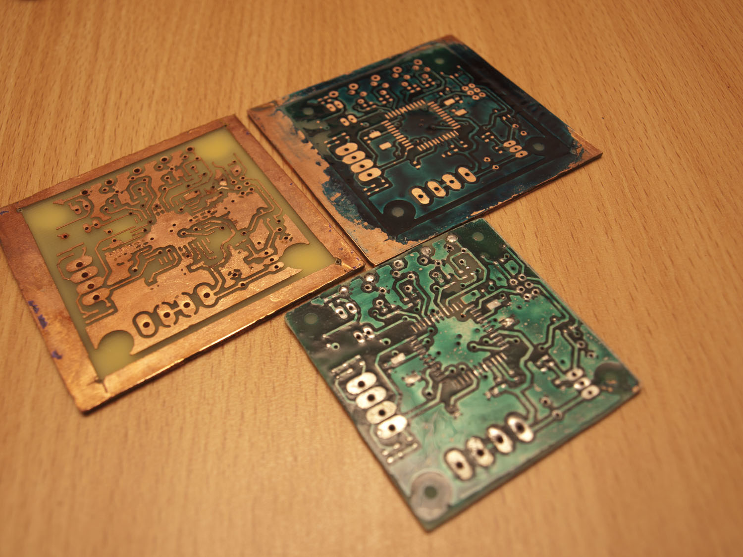 Строго не судите, первый раз вытравил плату в конце января, до этого даже не видел как это делается. Зато эти платы с металлизацией отверстий. И никогда не покупайте паяльную маску (зеленую краску для плат) на ebay - там правильной паяльной маски нет (на фото как-раз та неправильная маска). В апреле придут качественные материалы и я доделаю ЧПУ сверлилку, тогда опишу подроно че к чему.