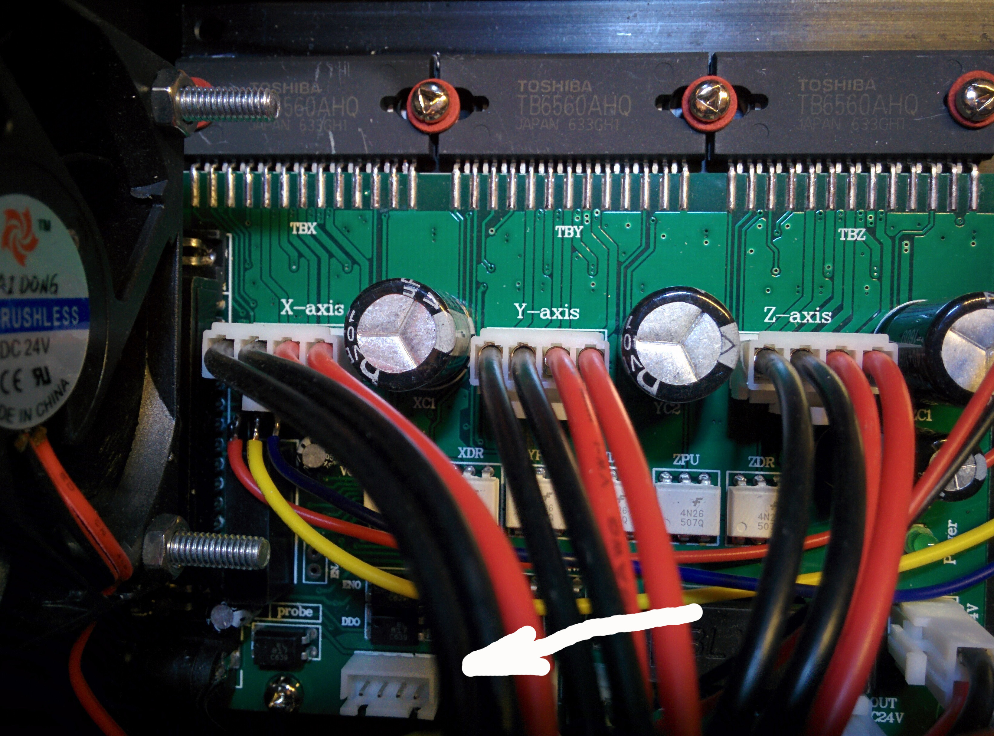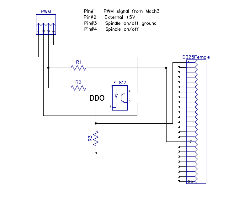 Поныряв под стол пару дней, пришла мысль открыть контроллер и посмотреть, можно ли на время удлинить кабель и вывести тумблер наружу. Внутри был обнаружен 3-осевой контроллер JP-382A, драйвер 4-ой оси JP-1635A, ,небольшой сетевой фильтр, БП на 24В и простенький контроллер шпинделя ZB319-D. Начав разглядывать это хозяйство, обнаружил на плате JP-382A неподключенный разъем PWM OUT с оптопарами неподалеку, подписанные как DDO и EDO и решил кабель пока не удлинять и попробовать разобраться с этим разъемом. Поиски схемы этого блока ни к чему не привели и я пошел в рукопашную. Прозвонил все вокруг разъема, нарисовал кусок схемы и выяснилось, что на разъем идут сигналы с LPT на управление PWM (пин 17) и на оптопару DDO для вкл/выкл шпинделя (пин 1). Отложив изучение вопроса управления скоростью на потом, я быстро набросал схему и из того что было собрал платку для управления питанием шпиделя. Платку установил на дне контроллера рядом с JP-1635A и решил проверить что у меня получилось. Запустил Mach3, включил контроллер. Шпидель начал вращаться. Залез в конфигурацию, выставил, как считал правильным, но шпиндель вращался постоянно и не реагировал ни на какие изменения в конфиге. Так же он продолжал вращаться и после выхода из Mach3 ....