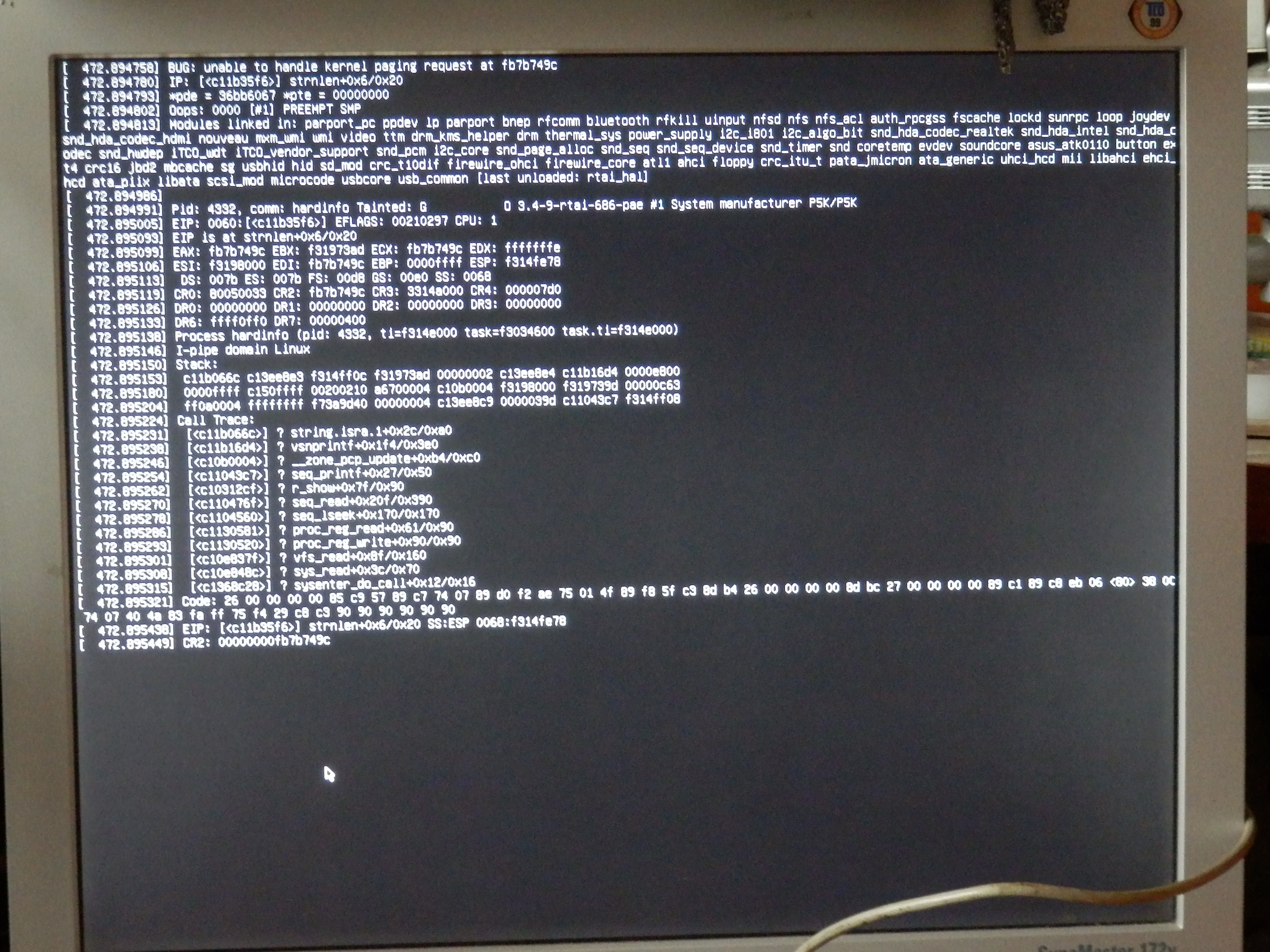 нет. указатель переданный в strlen указывал на место в адресном пространстве, по которому не было фактических данных. После детектирования этого ядро должно было отмапить часть файла в АП процесса, но ничего из этого не получилось, "unable to handle kernel paging request at 0xfb7b749c". По этому адресу должен был находиться какой-то строковый литерал (или format string для vsprintf, или один из ее аргументов).