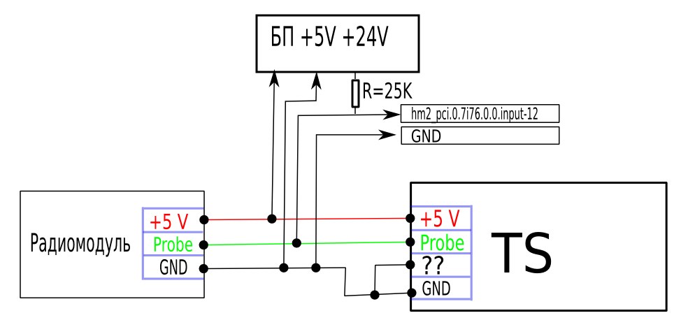 Можно так : RFM подключаем к +5 питанию и соответственно к земле, выход probe RFM подключаем к земле TS, +5 к питанию TS, выход TS забираем как probe сигнал(с тем же резистором подтяжки). Получили типа ИЛИ инвертированных сигналов(надо будет возможно инвертировать hm2...input...).