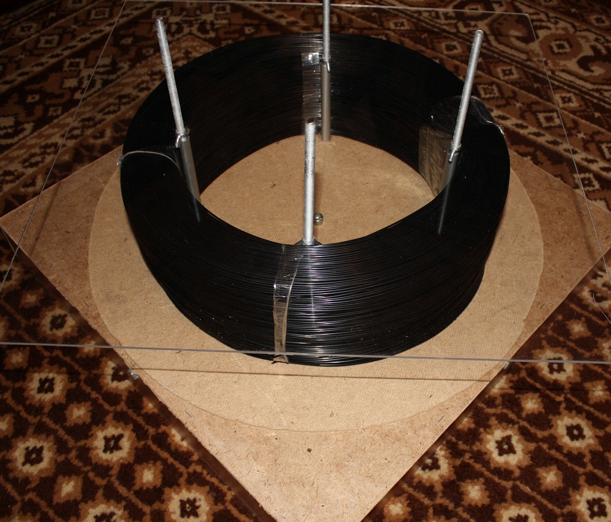Столик с подшипниками на котором свободно крутятся 5 кг пластика, забираю его через небольшой блок.