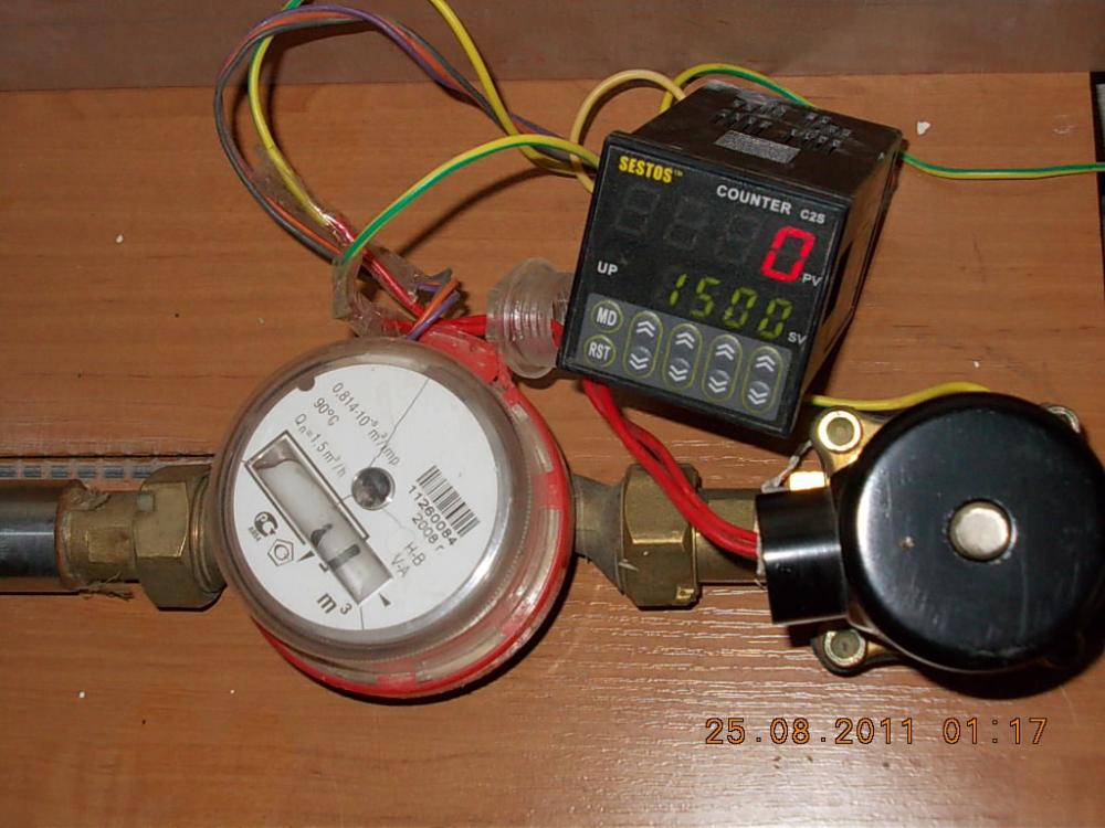 На счетчике выставляю сколько литров как на фото 150.0 литра. Верхние цифры поазывают сколько уже налито. Когда будет набрано 150л электроклапан закроет воду.