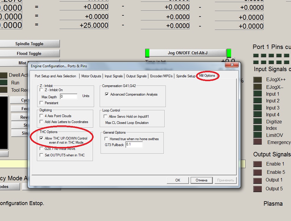 С этого я и начинал с оф сайта скачал демо версию и удивился что не работает Torch Up Down в THC? причем сигнал Torch On работает везде в G коде доходит до M3 и стоит ждет Torch On при появлении сигнала продолжает программу но вот Up, Down ни как не хочет ось Z крутить.