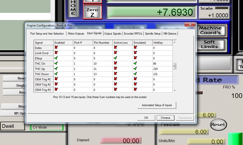Входящих портов 8 так вот подключил к ним датчики осей и три сигнала на Torch ON, Torch Up, Torch Down. В настройках порты прописал всё четко.