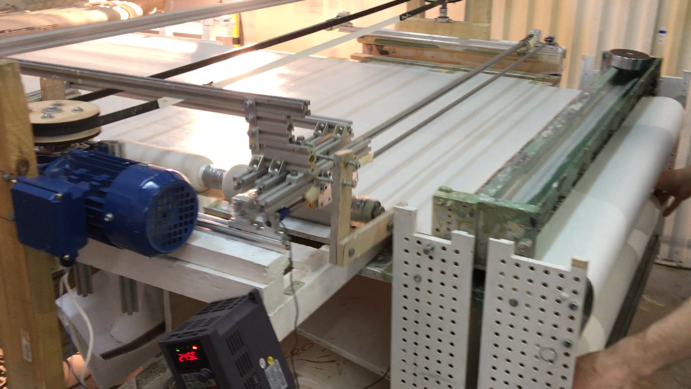 Модуль с раскаточными валиками. Поролоновые валики катаются на 130 см туда-сюда. Часть деталей уже есть. В качестве рамы используем конструкционный алюминиевый профиль. Детали и крепежи мы заказываем в слесарной мастерской и в лазерной резке. Так же есть свой 3д принтер. Двигателю нужно задать несколько режимов работы.
