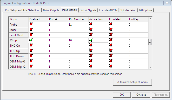 Опять взялся за старое, теперь никак не могу заставить mach3 увидеть замыкание концевика, может кто сталкивался с такой проблемой? Дополнительное питание 12 вольт есть. Замерял PIN10 там 9.49 вольт, на GND 0 вольт. Когда замыкаю то на PIN10 тоже 0, но mach никак не реагирует....