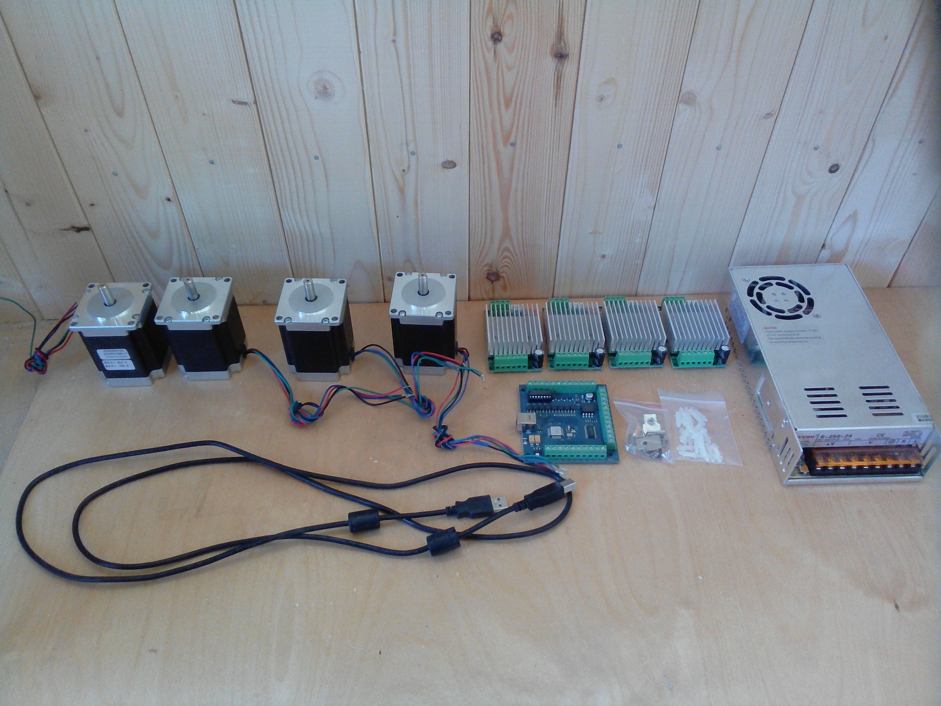 Шаговые двигатели Nema 23, плата опторазвязки TB6600, драйвера 4шт, блок питания 24в 10ампер, диск mach3.+Кабельль USB.