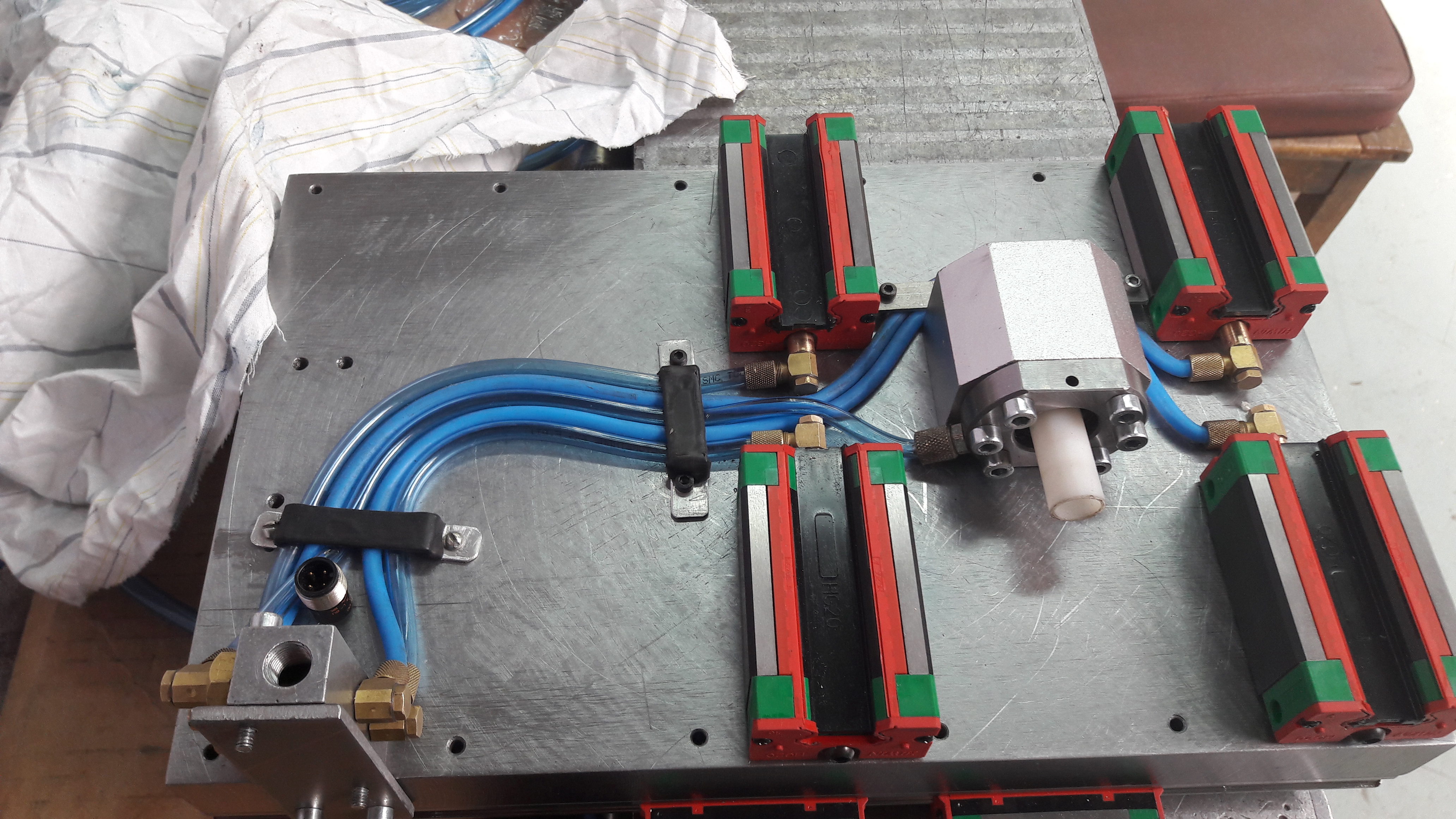 Добрый вечер всем! Начал постройку чпу фрезера на базе чугунной поверочной плиты. Размеры плиты 600X450 мм. Станок из стали. рабочее поле Y 300 мм X 350 мм и Z 110 мм. Направляющие рельсы фирмы Hiwin шириной Z 15 мм на остальных координатах 20 мм. Винты фирмы TBI с Двоиной гаикой. Передача на винты через зубчатый ремень профиль HTD 5m. Чуть позже выложу фото о проделанной работе. Сейчас столкнулся с проблемой выбора сервы на шпиндель. не могу определиться с мощностью для нормальной обработки мягких металлов. Есть шпиндель от какого то старого немецкого станка с хорошими параметрами по биению в пределе 3 микрон. Конус морзе 4. С 4 подшипниками 2 передних 46109 и 2 задних 46108. Портал скручен и за штифтован и 20 мм стали после чего полностью отшлифован на шлифовальном станке. Детали моего станка изготовлены на чпу 5 осевом Hermle u40. На моем станке предусмотрена централизованная системам смазки кареток и швп. Общий вес станка около 300 Кг получается.