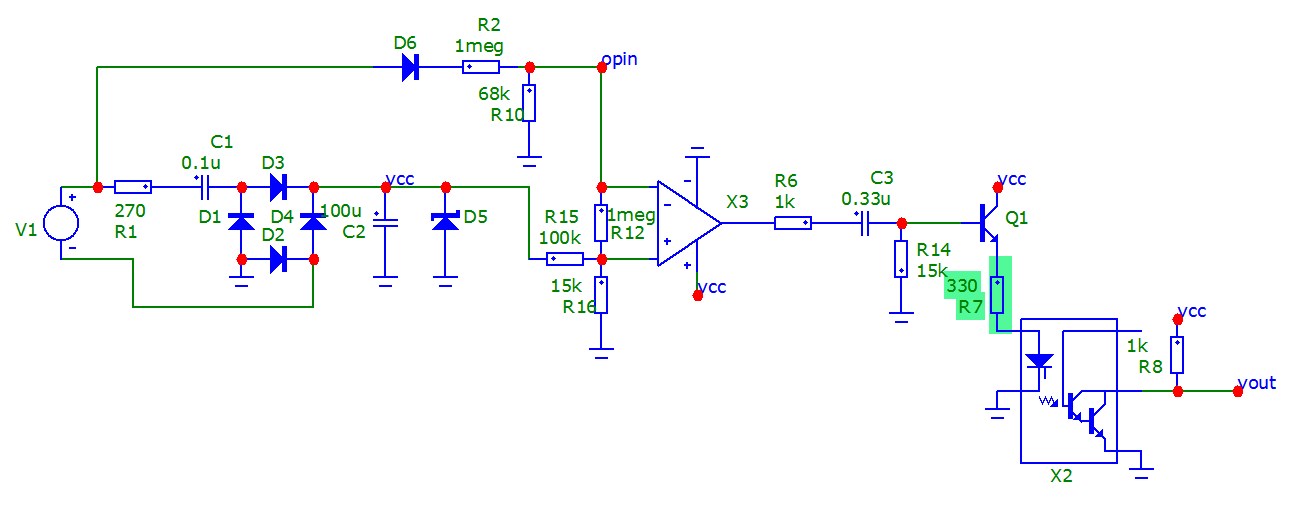 Да, я знаю что такое гистерезис :) Я имею в виду, что ОУ переключаться будет не при нуле, где напряжение может колебаться, а уже на подъеме синусоиды, где шансов на это гораздо меньше. Плюс еще небольшую защиту от импульсных помех дает конденсатор в базе транзистора, да и у оптопары частота не бесконечна :)