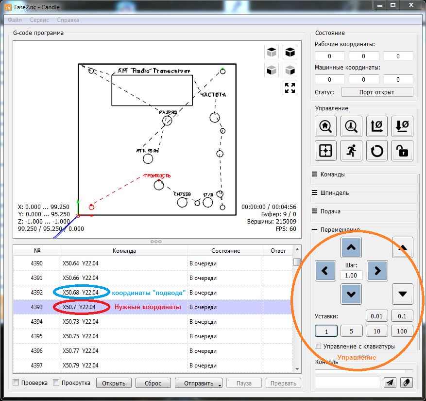 3. Стрелками и кнопками 100...10...0,01 в Candle, вручную подвожу головку лазера к координатам, указанным строкой выше, чем та на которой остановил программу.