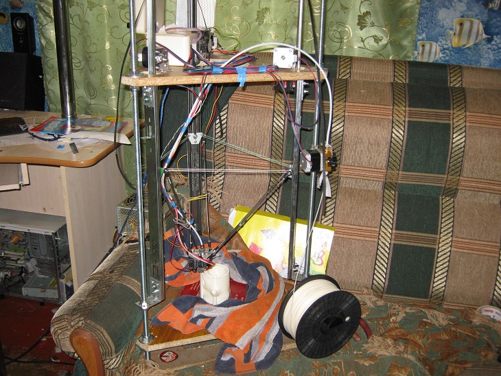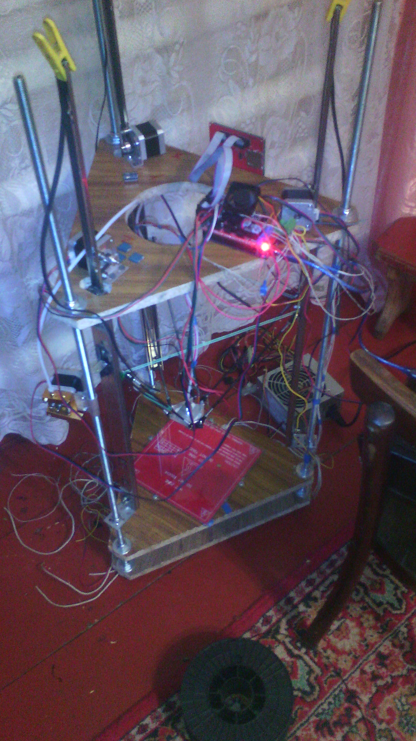 Мой принтер работает прочти каждый день. На стол я клею малярный скотч который имеет толщину примерно 0,01мм. И я всё ни как не мог понять почему первый слой то ложится хорошо, то просто накладывается и приходится наклеивать второй слой скотча, то просто впечатывается в стол и я совсем убираю скотч. С начало я думал что это погрешность мех.концевиков и купил оптические но история повторилась. Я в принципе забил на это и просто то клею то отдираю скотч. А вчера меня осенило я нашёл причину. Дело вот в чём. Я живу в своём доме и у меня печное отопление и в доме то тепло то прохладно а принтер стоит на полу. Всё банальное расширение металла. Диагональные тяги я сделал из электродов ф4 они то и играют. Надо придумать из чего сделать, графитовые у китайцев что то дороговато жаба душит.