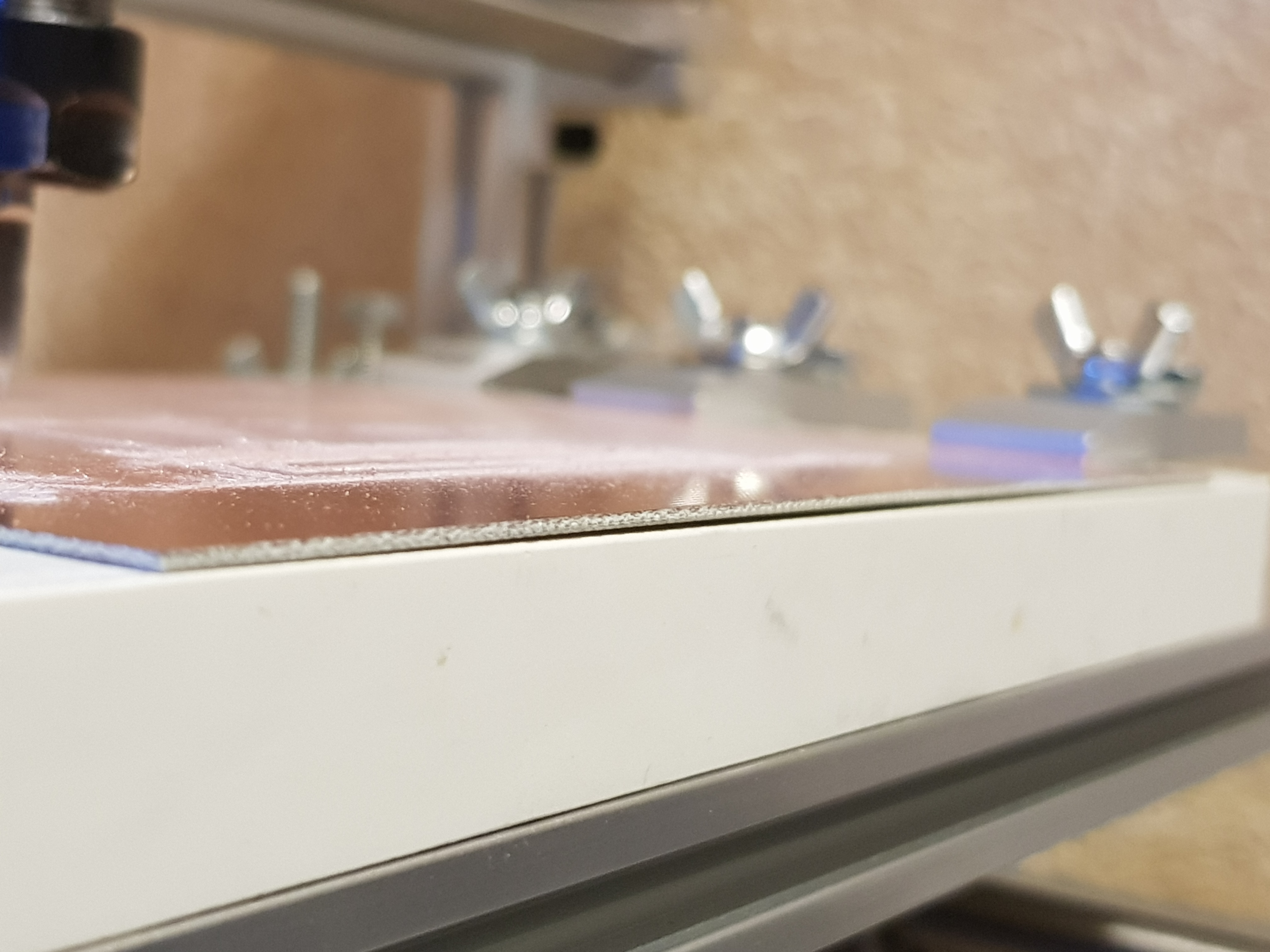 *На столе закреплен кусок ЛДСП с помощью 2 прижимов, выравнивал для удобства по грани стола. Далее на него приклеивается печатная плата на обороте которой два отрезка тонкого двухстороннего скотча (провод для клеммы Z-щупа припаян заранее), плата центровал на глаз и по кромке ЛДСП. В итоге плата прижимается 4мя прижимами по краям для надежной фиксации. (на фотографиях другая плата, но способ тот же, запустил на пробу фрезеровку с измененными настройками пока пишу топик (заранее скажу так же неудачно)).