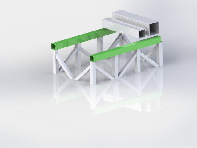 Основание из профиля 100*100*5. Ноги портала убрал, так думаю будет больше жесткости. Профиль на который операется портал(зеленый) 200*120*6, закреплять его к основанию планирую через болтовые соединения для возможности юстировки. Вообще сварки планируется по минимуму. Сам портал из профиля 200*200*8, кто то тут говорил что один большой профиль лучше нескольких скрученных.