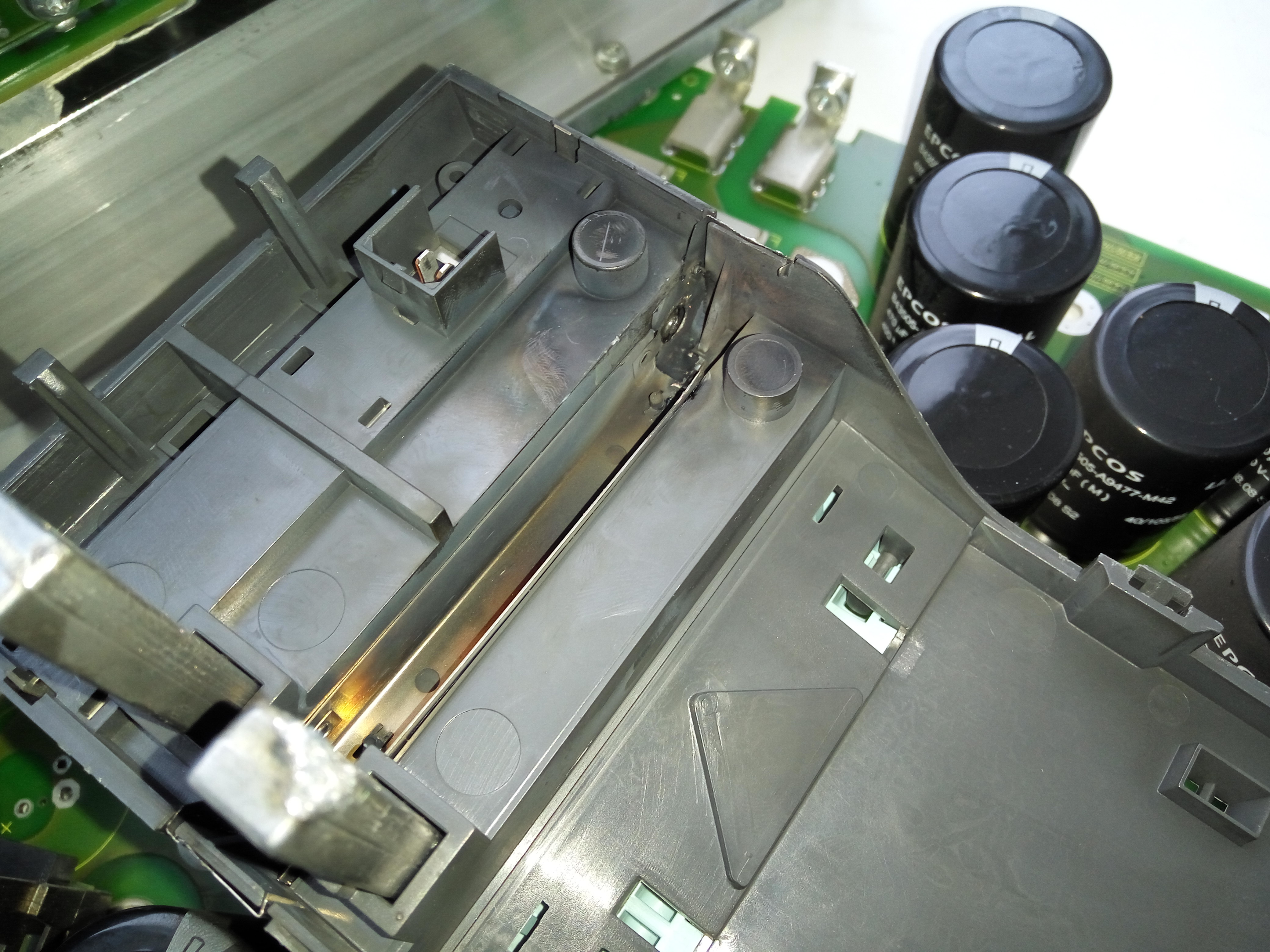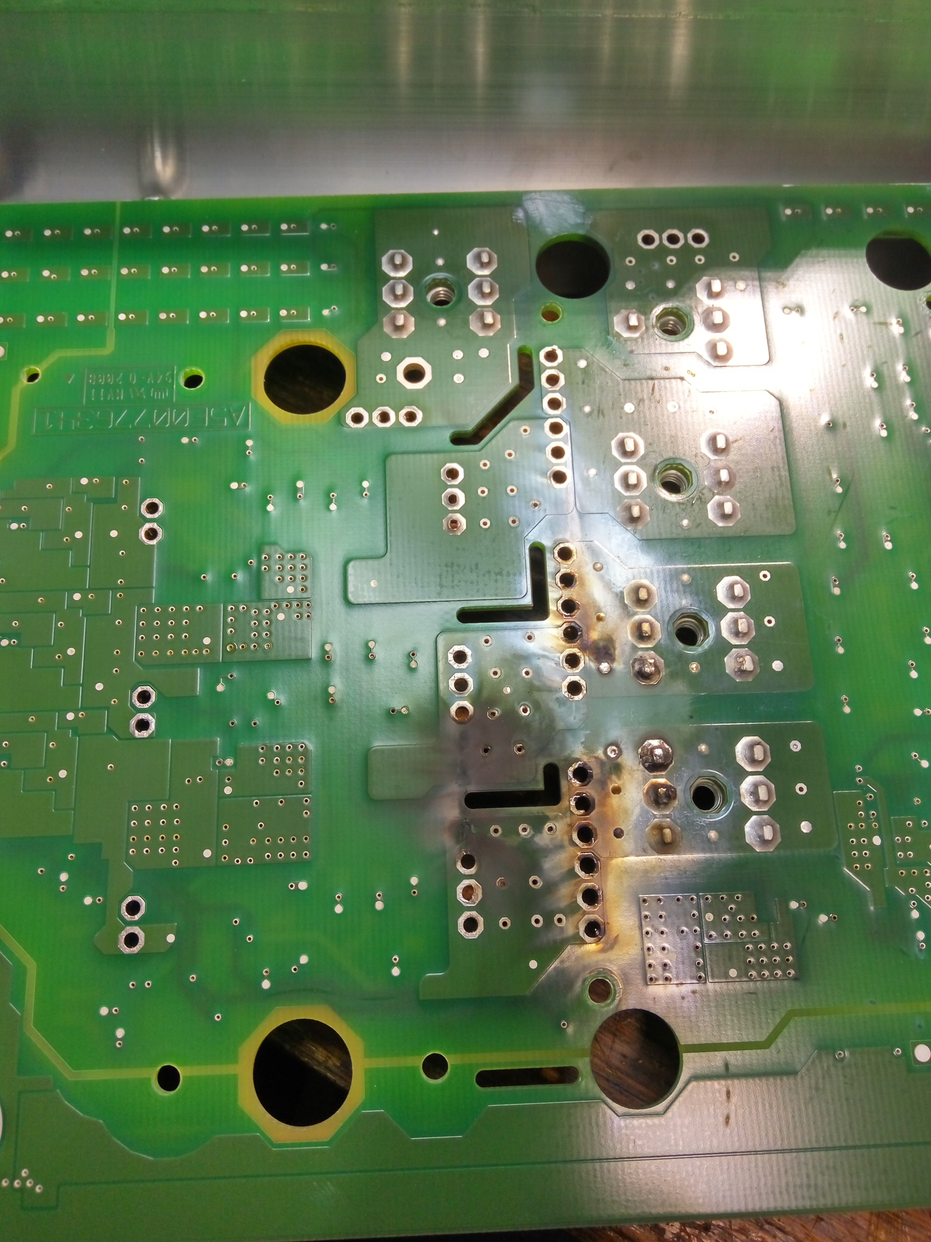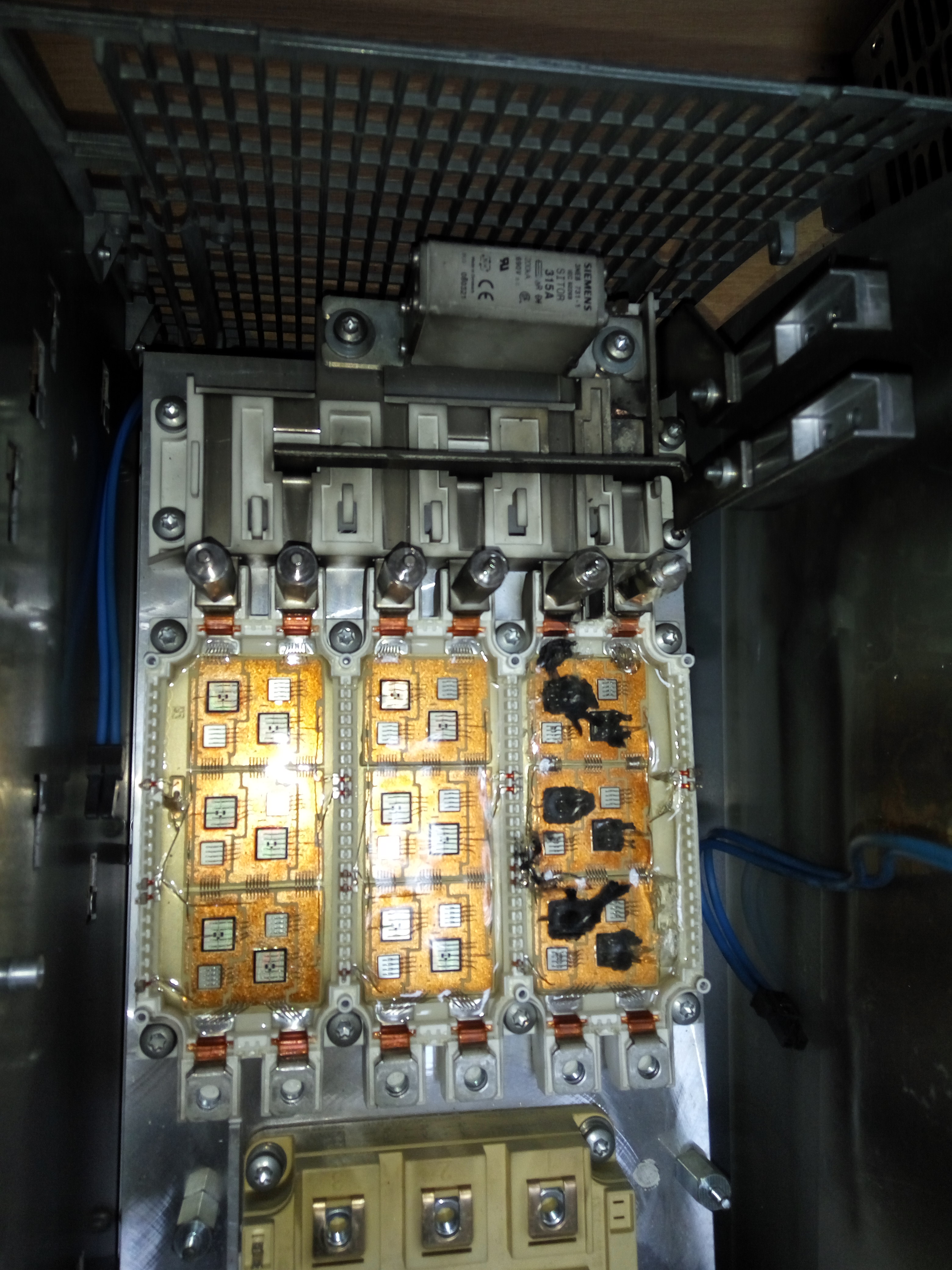 И ладно бы это случайность... Вот еще случай: не протянута шина между модулями, на втулке видны следы эрозии. Контакт начал греться и сделал дыру в пластике рядом: И все бы ничего, но под пластиком - заземленный экран: Опять начинается ад и сотона с полыханием, только уже под крышкой. Вообще силовая часть от мозгов изолирована оптронами и трансформаторами, но это пока дуга не находит что-нибудь пролетая мимо: В общем погорели и мозги тоже. Там же еще и шлейфы управления зацепило...