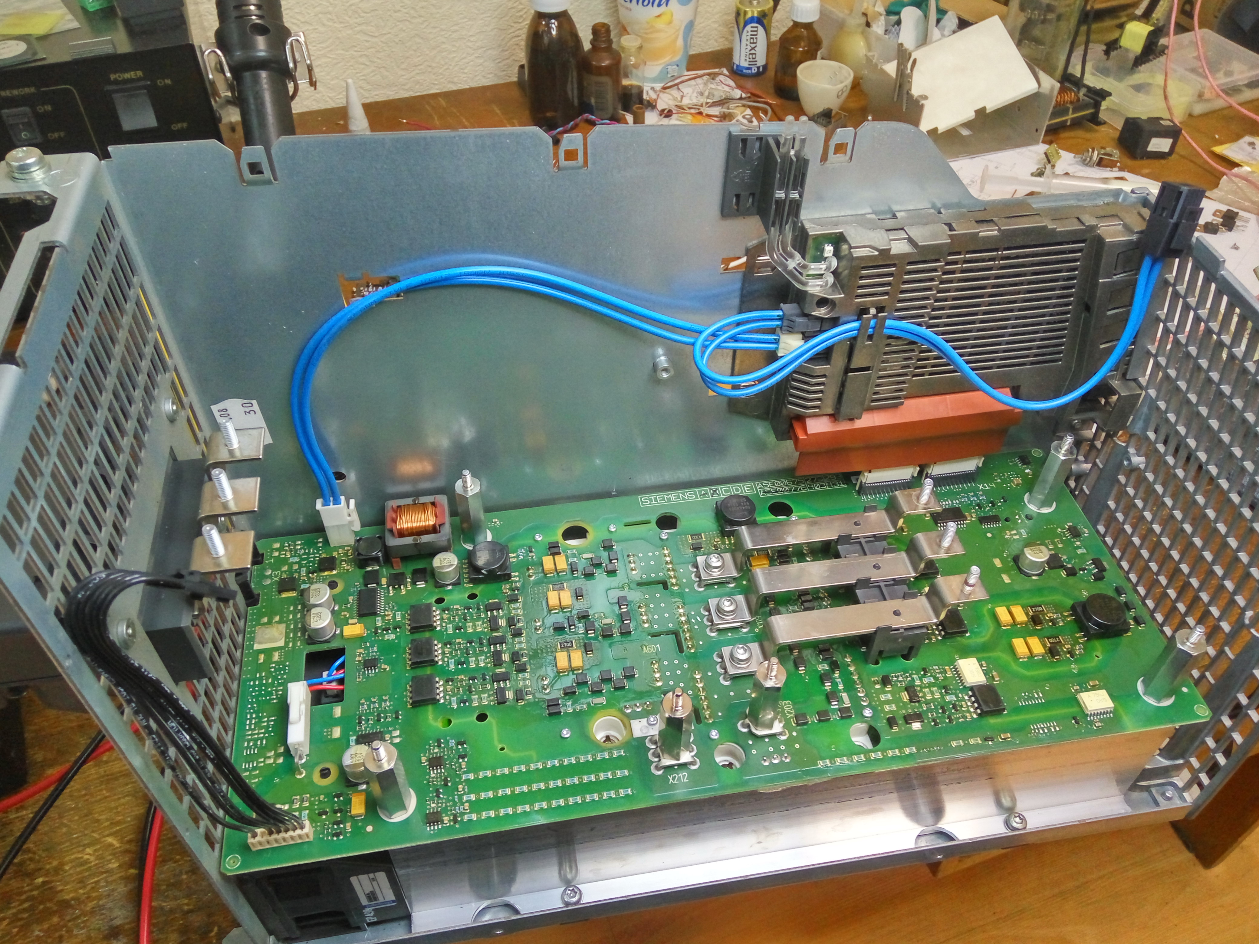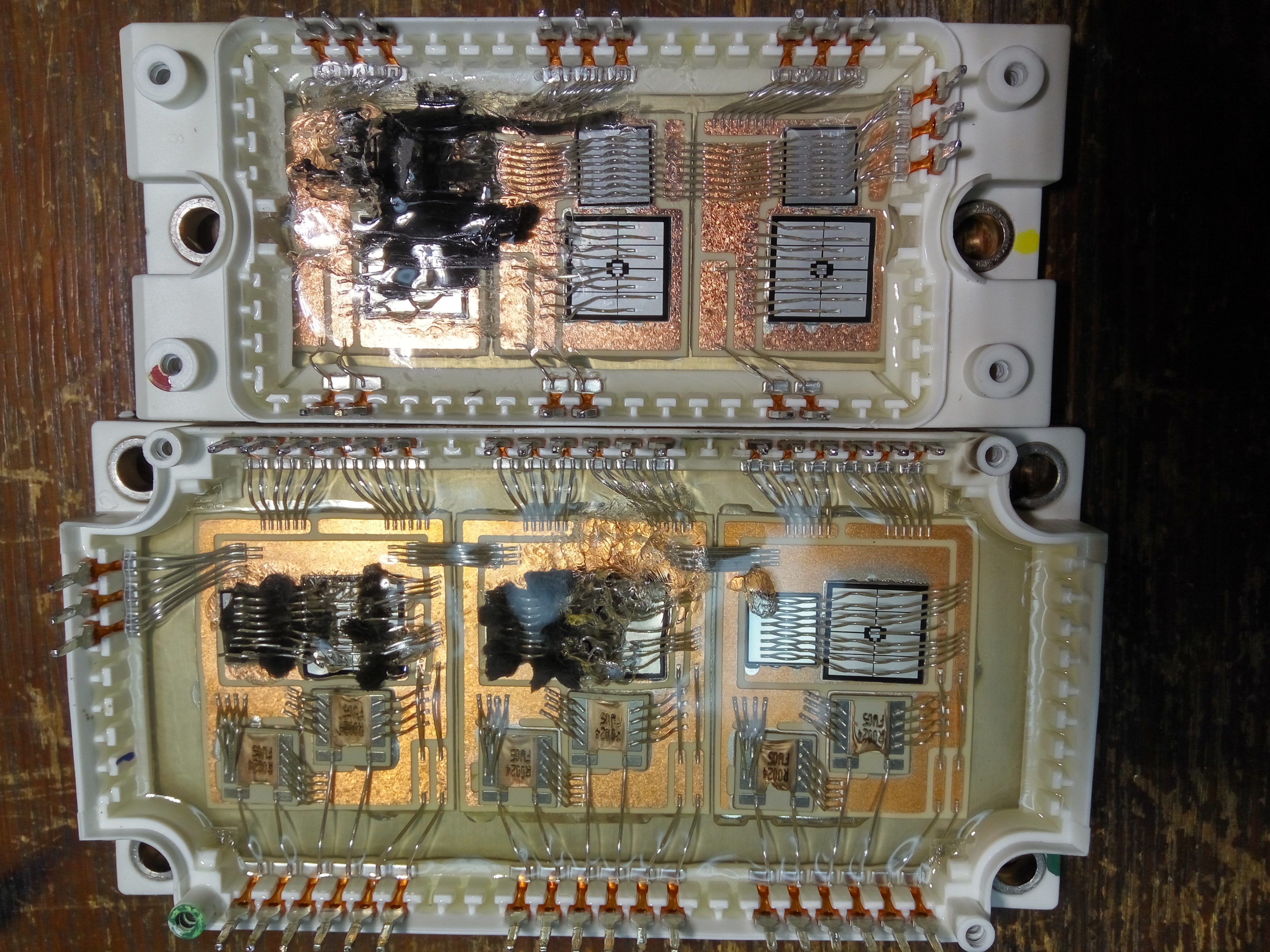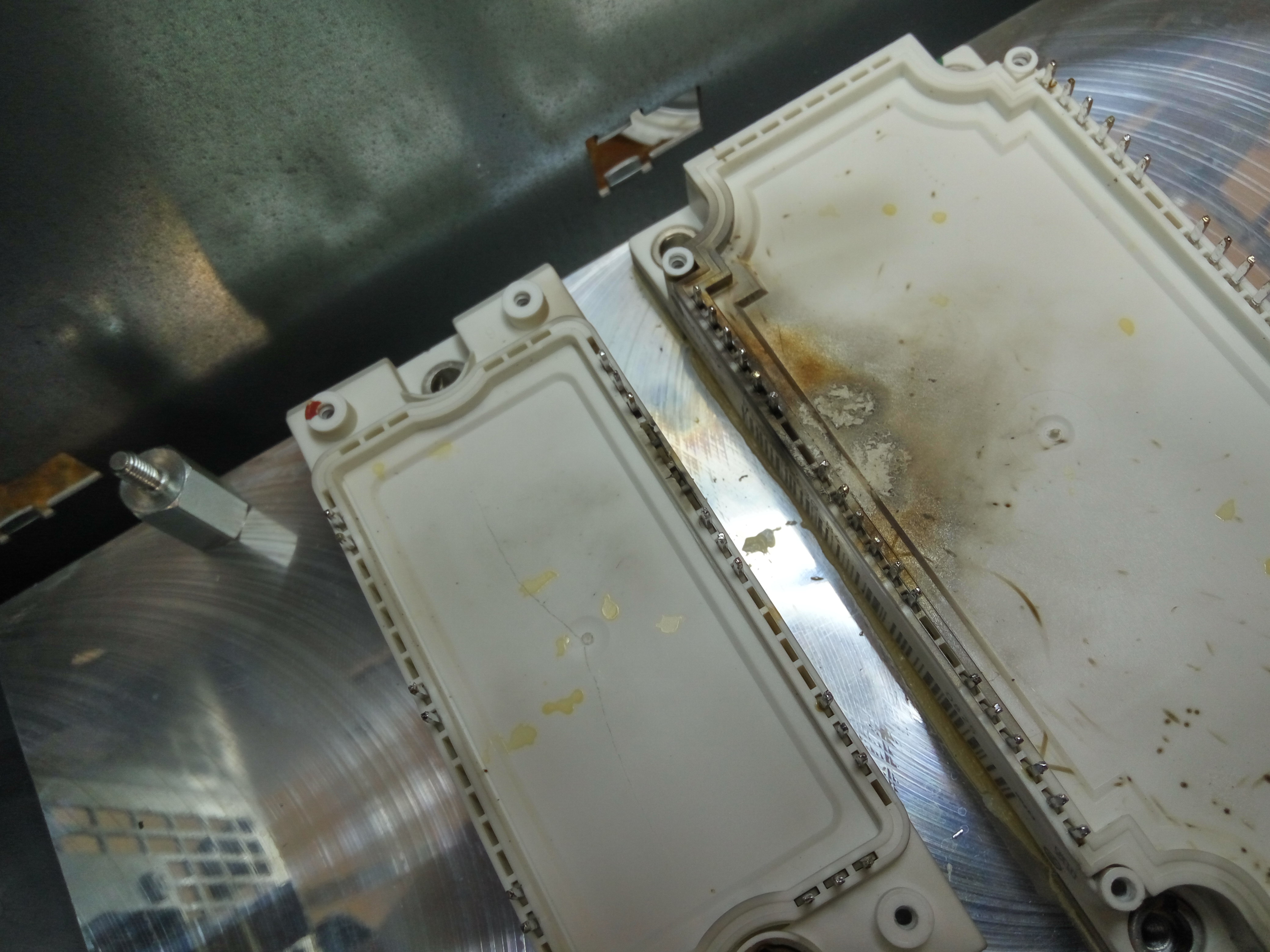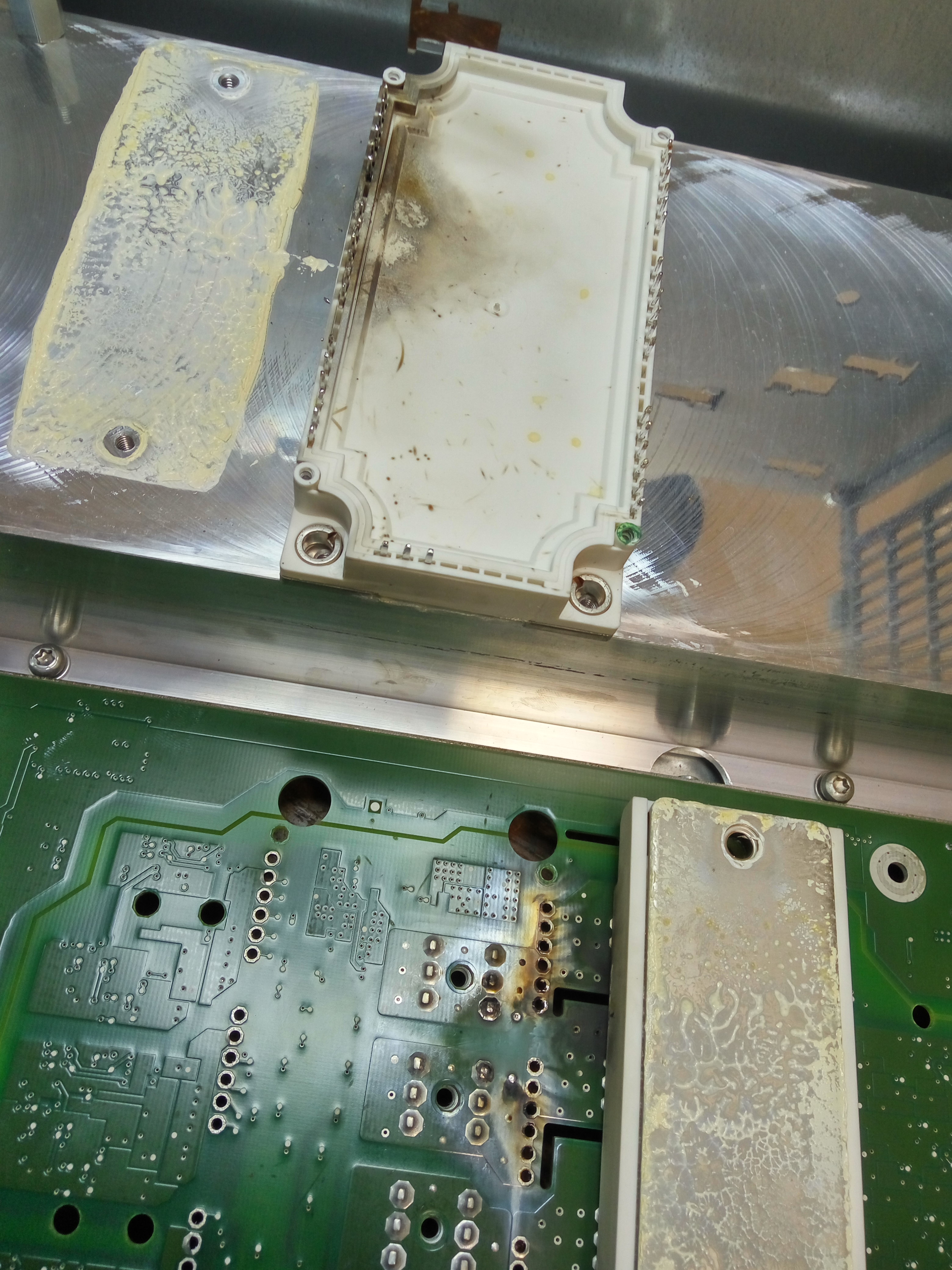 И ладно бы это случайность... Вот еще случай: не протянута шина между модулями, на втулке видны следы эрозии. Контакт начал греться и сделал дыру в пластике рядом: И все бы ничего, но под пластиком - заземленный экран: Опять начинается ад и сотона с полыханием, только уже под крышкой. Вообще силовая часть от мозгов изолирована оптронами и трансформаторами, но это пока дуга не находит что-нибудь пролетая мимо: В общем погорели и мозги тоже. Там же еще и шлейфы управления зацепило...