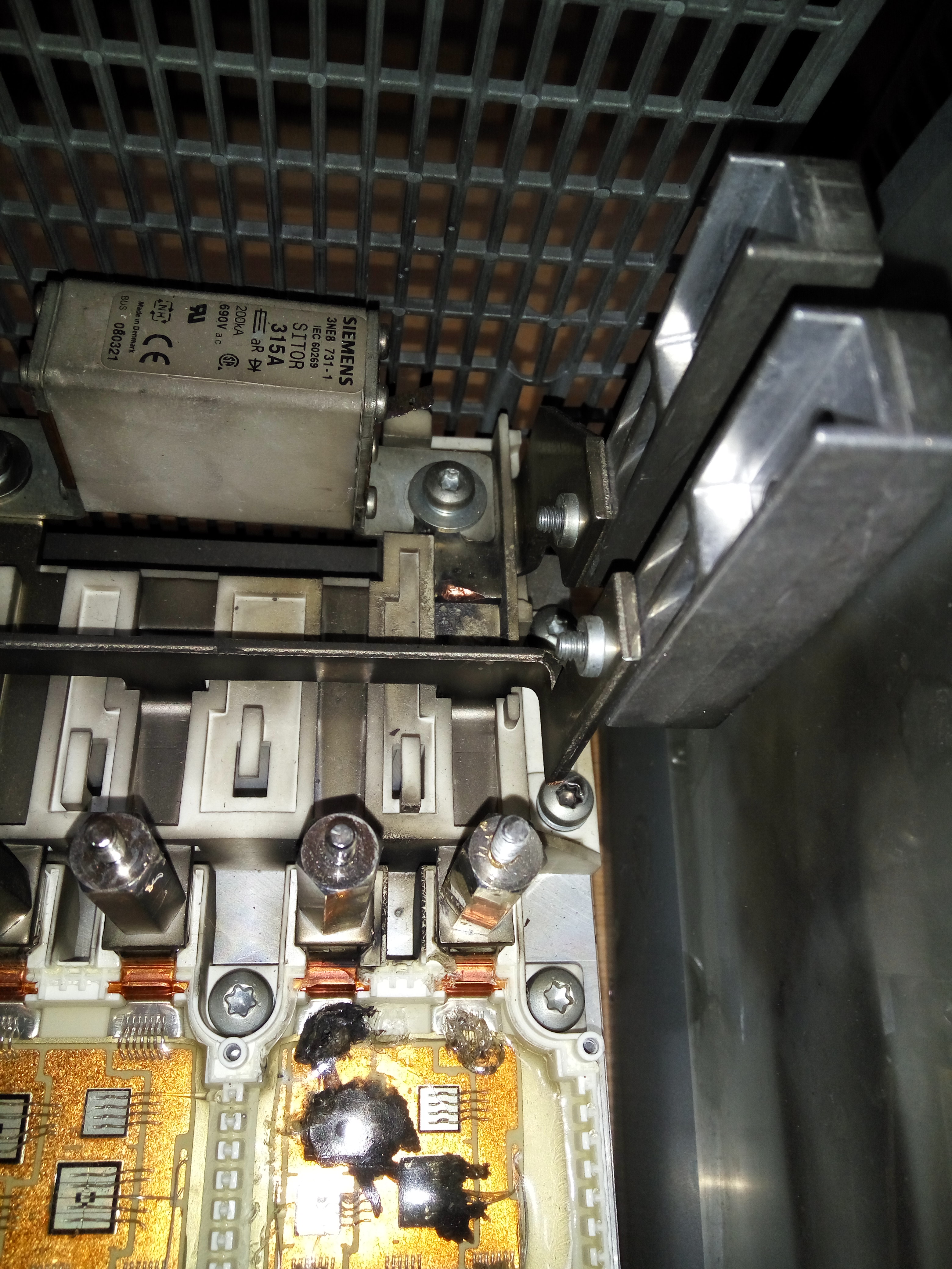 В общем хронология веселая: Стреляет модуль, ему подрывает крышку (на фото она уже снята) и плюет облаком горящей дряни в винтовые стойки, которые подводят постоянку к модуля. Между ними так же загорается дуга, все это счастье выжигает предохранитель на 315А по входу, но уже похрен, т.к. очередная вспышка перебрасывает дугу на входные шины ДО предохранителя: Грохот получается охренительный. Я не слышал, но операторы говорят впечатления так себе