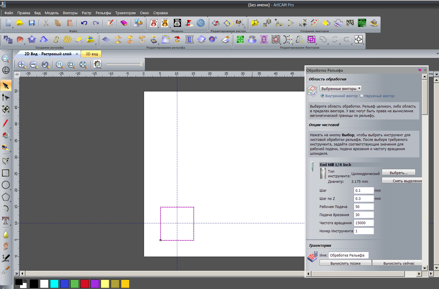 Выбираю обработка рельефа/выбранные векторы/внутренний вектор/фреза дюймовая 1/8