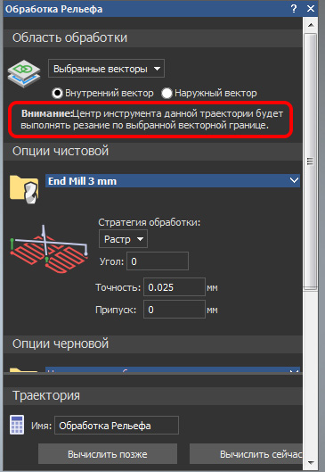Это если Вы делаете выборку внутри вектора. А Вы обрабатываете рельеф, то есть до самого вектора рельеф должен соответствовать заданному, а это значит, что фреза должна дойти центром до вектора.micgelly писал(а):Граница определена вектором и насколько я понимаю фреза ни при каких условиях не должна вектор пересекать.