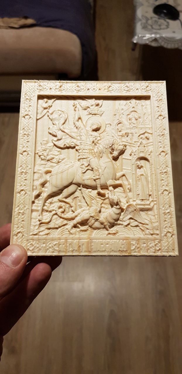 3) Попробовал в работе на такой вот иконе. Размер 130*150. Три прохода. 3 УП: черновая - фреза концевая d6 mm, рабочая подача 2200, подача врезания 1000, шаг 35%, обработка рельефа - фреза конусная d3 mm R1, рабочая подача 2000, подача врезания 1000, шаг 10%, ну и обрезка по контуру. В итоге работа станка над данной иконой заняла более пяти часов из которых больше 4-х это естественно 2-й этап.. Это нормально для такого размера изделия? Как лучше ускорить процесс с сохранением приемлимого качества?