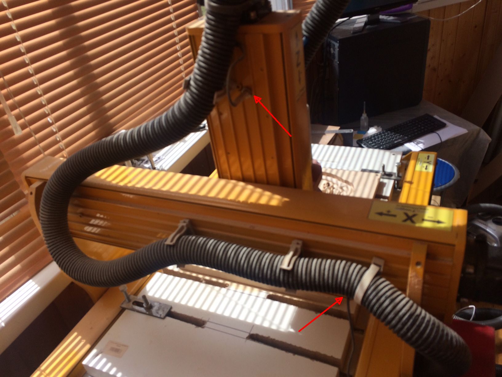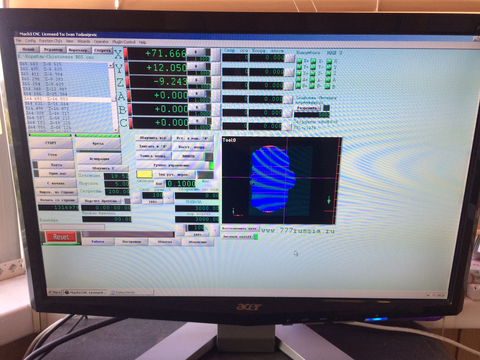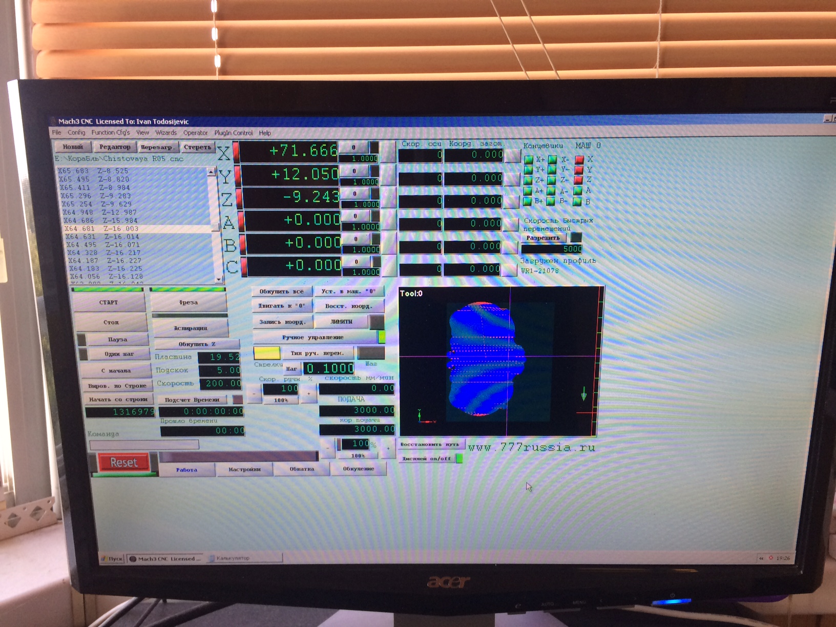 На данный момент шпиндель стоит в том же месте где остановилась УП, только поднял по Z, остальные оси не трогал. Комп перезагрузил, запустил снова Мач. Индикаторы машинного нуля, когда включаю шпиндель и перехожу на нужную строку в УП мигают зеленым и красным. Выставил в окошках X,Y,Z те же координаты что были в момент остановки УП.
