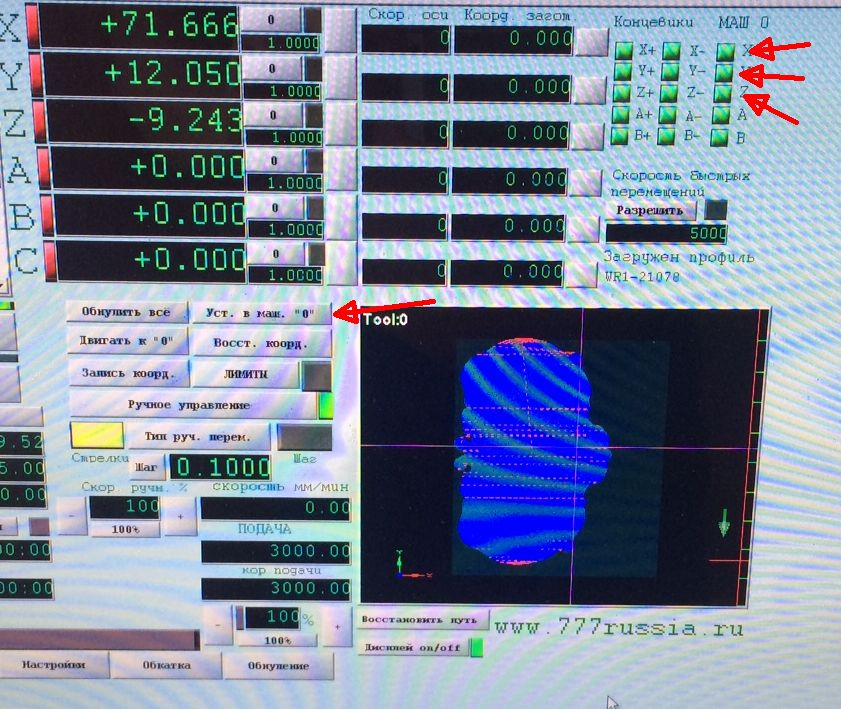 Что-то туго до меня доходит, прошу прощения)) Концовиков нет, в машинный ноль перед началом резки выставлял так: двигал кнопками X и Y в левый угол станка, Z максимум вверх. Нажимал кнопку "Обнулить все" и "Уст. в маш. "0" на моем скрине (морда другая у Мача, не стандартная). Загорались зеленым индикаторы (указаны стрелками на скрине). Т.е. я так понимаю таким образом я выставил машинный ноль, верно? Далее, еду кнопками в центр заготовки (в арткаме там у меня начало координат), там нажимаю "Обнулить все". Запускаю УП. Поработало час-два-три, зависло. Как действовать дальше, можно на пальцах, как слабоумному?))