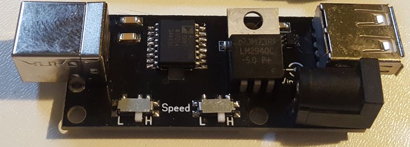Передача данных в режиме low и full speed: 1.5Мбит/с и 12Мбит/с - переключается на плате.