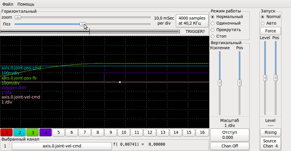 Уменьшаю обе *_VEL на два порядка, т.к. ждать пока привод докрутит до концевика на таких скоростях не хватит и месяца, нажимаю концевик пальцем. привод выдержал возросшую на парядок/два скорость, emc2 неуклонно "joint 0 failed".