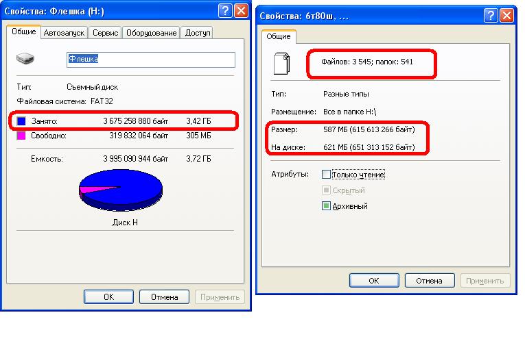 Дергаю свойства флешки показывает что флешка размером 3.72гб, свободного места 304мб. Но когда выделяю все папки на флешке размер 600мб