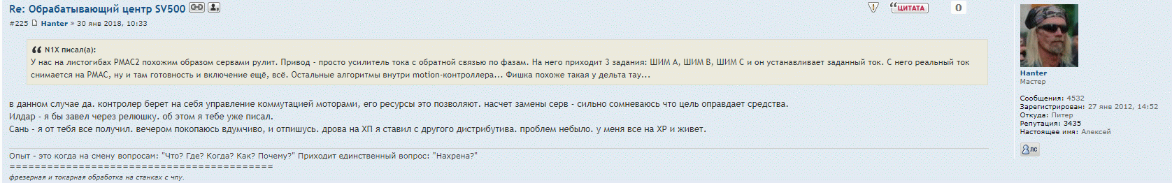 Да все до хантера доходит. особенно что "своя хата ближе". это ж когда тебе что-то нада - все должны подорваться и помочь тебе с чем то... станок посмотреть... фторопласта купить... робота взять и отправить... с дельтой разобраться.. причем все бесплатно... а как тебя попросил - ты не обязан... Да и хрен бы с тобой. ничего ты мне не должен и не обязан. Но вот еще раз повторюсь - человеком тебя после этого считать..... ну я по крайней мере точно не буду.aftaev писал(а):Видимо это до Hantera не доходит, что ему не обязаны делать фотки только потому что ему так захотелось.
