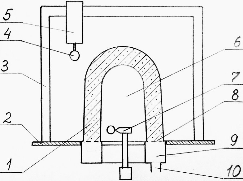 В качестве практического примера реализации способа изготовили из песчано–гипсовой смеси модель отливки подставки под колону. Сухой песок с добавкой 20…25% полуводного гипса (желательно еще давать до 5% цемента, ускоряющего твердение гипса) формовали способом ВПФ в оснастке, подобной стержневому ящику со стенками, предварительно покрытыми эластичной синтетической пленкой, - получали ведро-подобную песчаную заготовку на рис. В соприкосновение с песком вводили вакуумпровод, герметизировали стыки концами этой пленки, выступающей за пределы песка и лежащей на стенках вакуумпровода. Затем вакуумпровод подключали к вакуум-насосу через штуцер 10 трубопроводом, на котором имеется вакуумметр и кран. Заготовка под вакуумом приобретала прочность, ее устанавливали на столе 2 и крепили к столу.