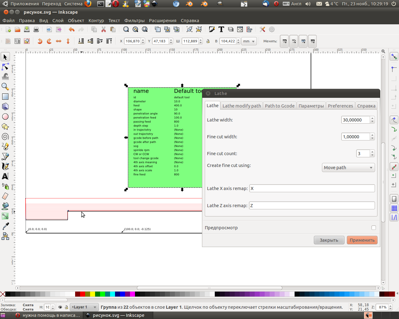 1. открываем файл. Включаем прилипание к середине отрезков и двигаем контур так, чтобы ось вращения совпала с нижней границей листа. А ноль был снизу слева. 2. Удаляем нижнюю половину. Для этого нажимаем F2 выделяем нижние точки и нажимаем Del. 3. У тебя контур состоит из нескольких кусков, если пиблизить видно, что концы не стыкуются (также можно нажать Контур-Разбить и если в итоге будет больше одного контура, значит в нем несколько частей). Для соединения, нажимаем F2 выделяем узы и тыркаем вот эту кнопку. 4. Все готово можно приступать к экспорту. Заходим в Gcodetools-Lathe. И пишем директорий для вывода Gкода. 5. Открываем вкладку Lathe и в верхнюю строчку вводим толщину заготовки.