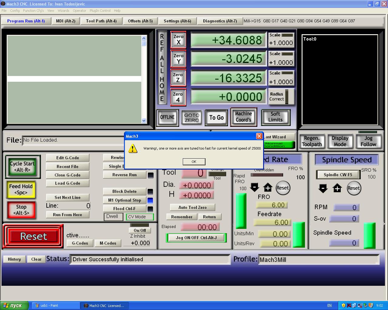 в расширителе нет. И в обоих случаях в диагностике ничего не приходит при замыкании z probe. А так же никогда не работала e stop кнопка. В режиме расширителя ругается на высокую частоту. Я поднимал частоту в мач, перепробовал все частоты, но это ничего не даёт.