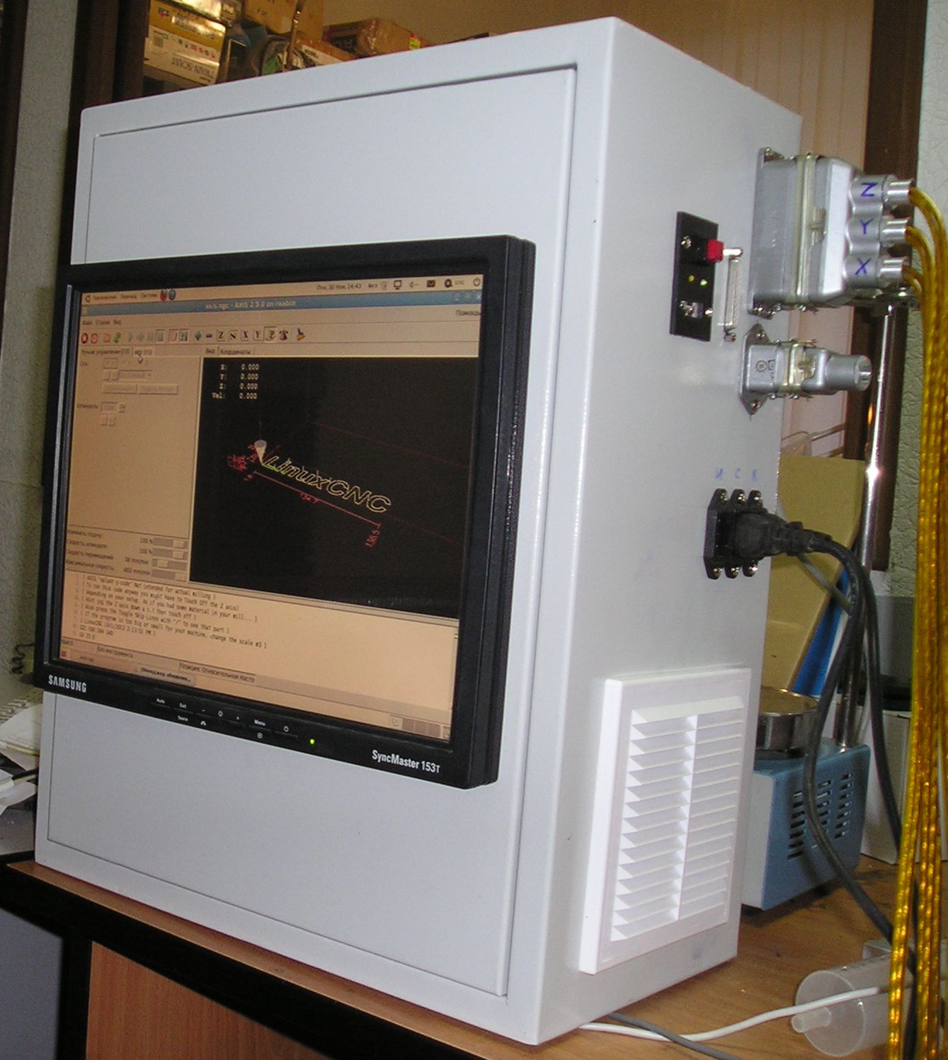 На левой стенке - вентилятор охлаждения 120 мм. Это про него http://www.cnc-club.ru/forum/viewtopic. ... 412#p46412