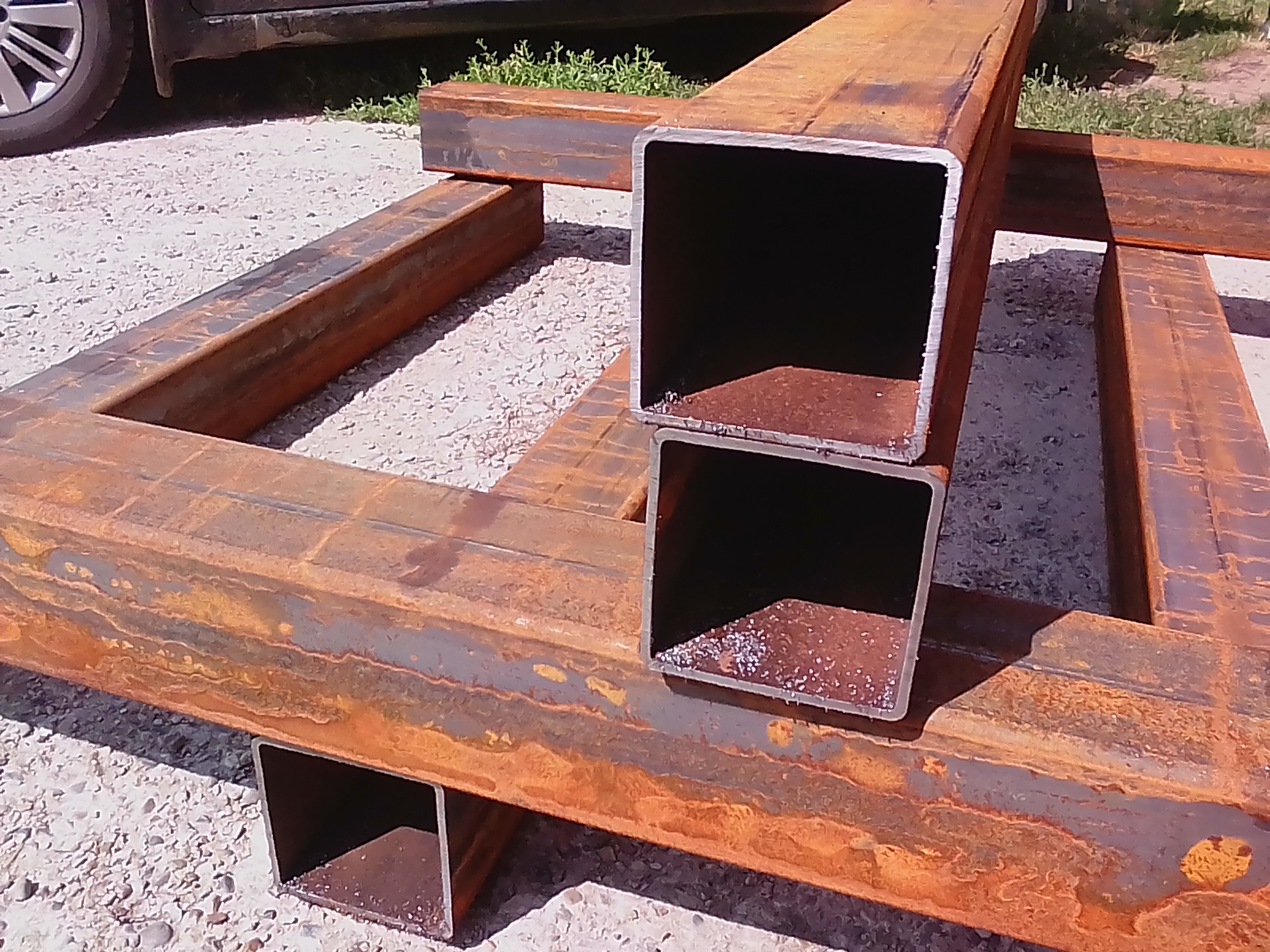 Определился с трубой. Купил уцененную ржавую трубу 120*120 стенка 5 мм. Попросил напилить сразу в размер на ленточной пиле, чтобы с болгаркой вокруг нее не бегать, а заодно и на доставке смог сэкономить, части аккуратно влезли в мою машину (хотя и нелегко было закинуть так чтобы не сломать обшивку или еще что, все-таки все куски вместе 200кг).Теперь можно смело делать проект под конкретную трубу.