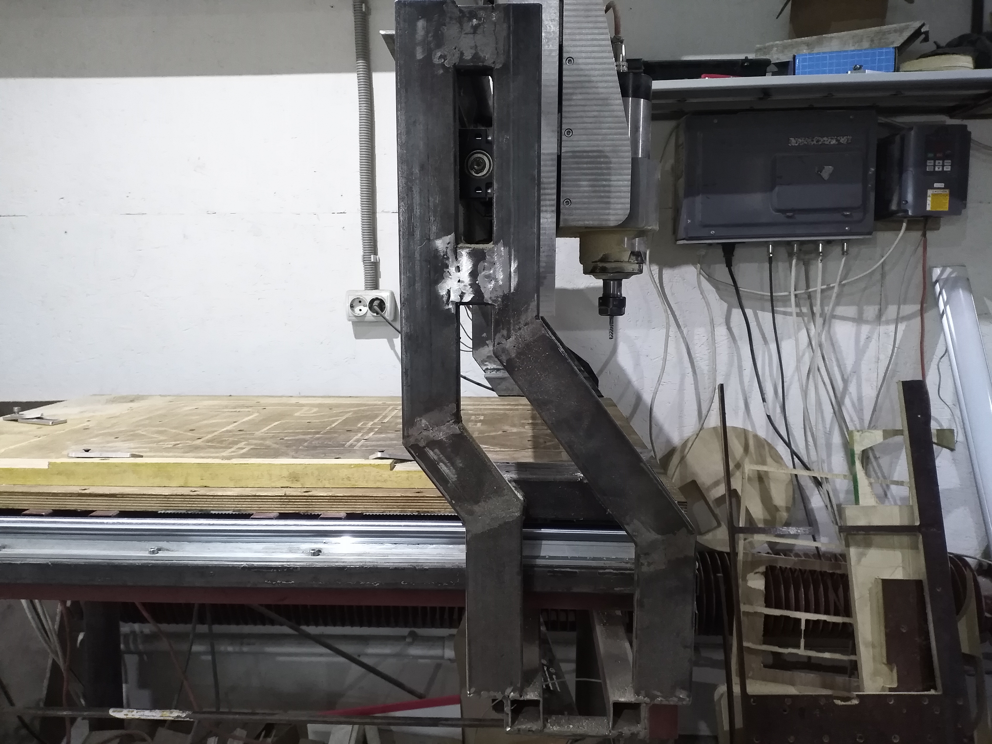 Всем привет. Имею станок собранный в основном из профильных труб, ось Z из алюминия. Направляшки по всем осям цилиндры на опорах 16мм (1000,800,350мм) ШВП по всем осям 1605 - стандартный набор из китая. При всем этом дрожит как холодец, слабые места знаю (стойки портала и перемычка для гайки оси Y). При смене направления например угол 90гр отчетливо видно дрожь, а на резе затухающая волна. Есть желание сделать станок жестче без серьезных вложений. По сути останется только ось Z в текущем виде, направляющие и винты с двигателями. Переделать планирую раму все из той же черной трубы 80х80, стойки портала планирую фрезернуть из алюминия 30мм толщиной + ребра жесткости, перемычку под гайку так же из алюминия 20мм, а сам портал из трубы 80х40 в 3 слоя. Если получится под рельсы на трубы наварю полосы 6-8мм и отдам на фрезеровку чтоб хотя бы малось ровно было.