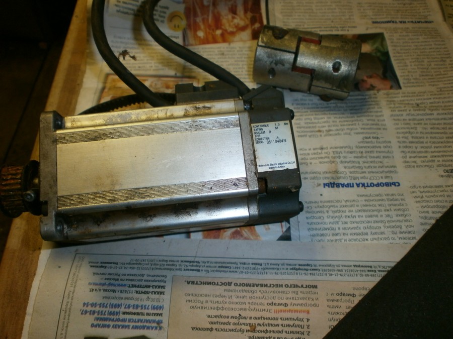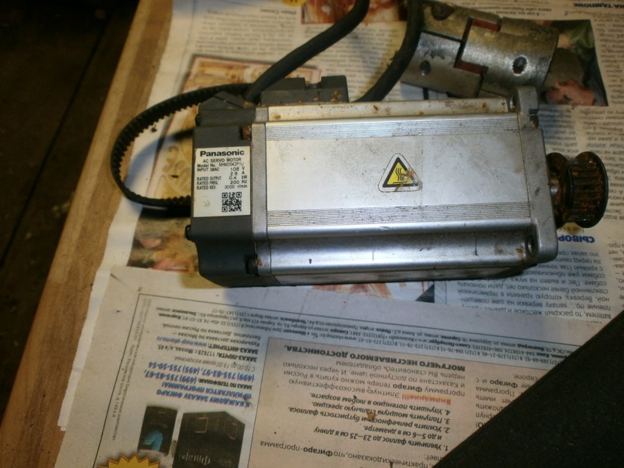 Две каретки к ним (буду искать ещё) Шаговый мотор нонейм, без опознавательных знаков. Сервомотор панасоник вроде как с тормозом (или моментометром) , скорее всего будет продаваться или меняться. Зубчатый ремень длинной около восьми метров широкий на стальных струнах (тросиках?) трехфазный преобразователь 0.75 кВт вроде как до 400 Гц (может подойдет для шпинделя)