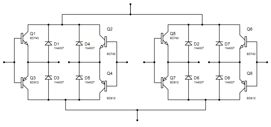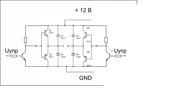 *соответственно, транзисторы КТ972, КТ973, диоды 1N4007, вверх "+", низ -земля(GND), внешние(на базы)- входы с предыдущего Н-моста, внутренние - выходы на обмотки двигателя,