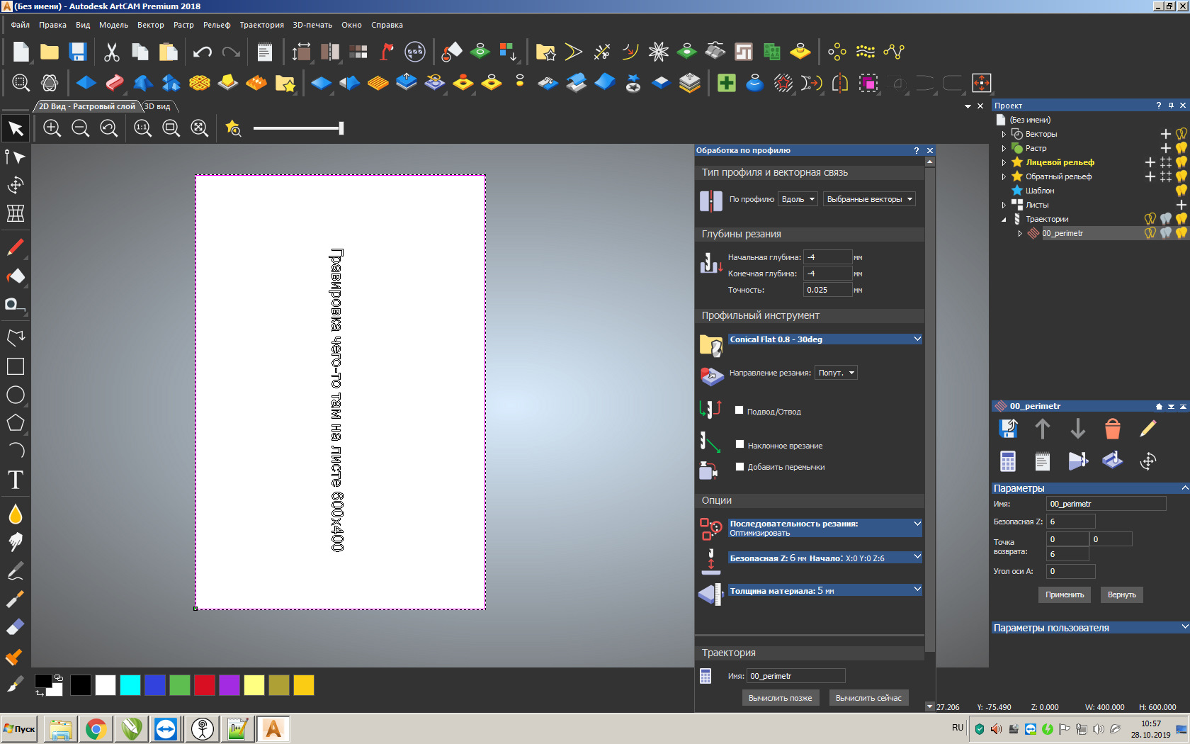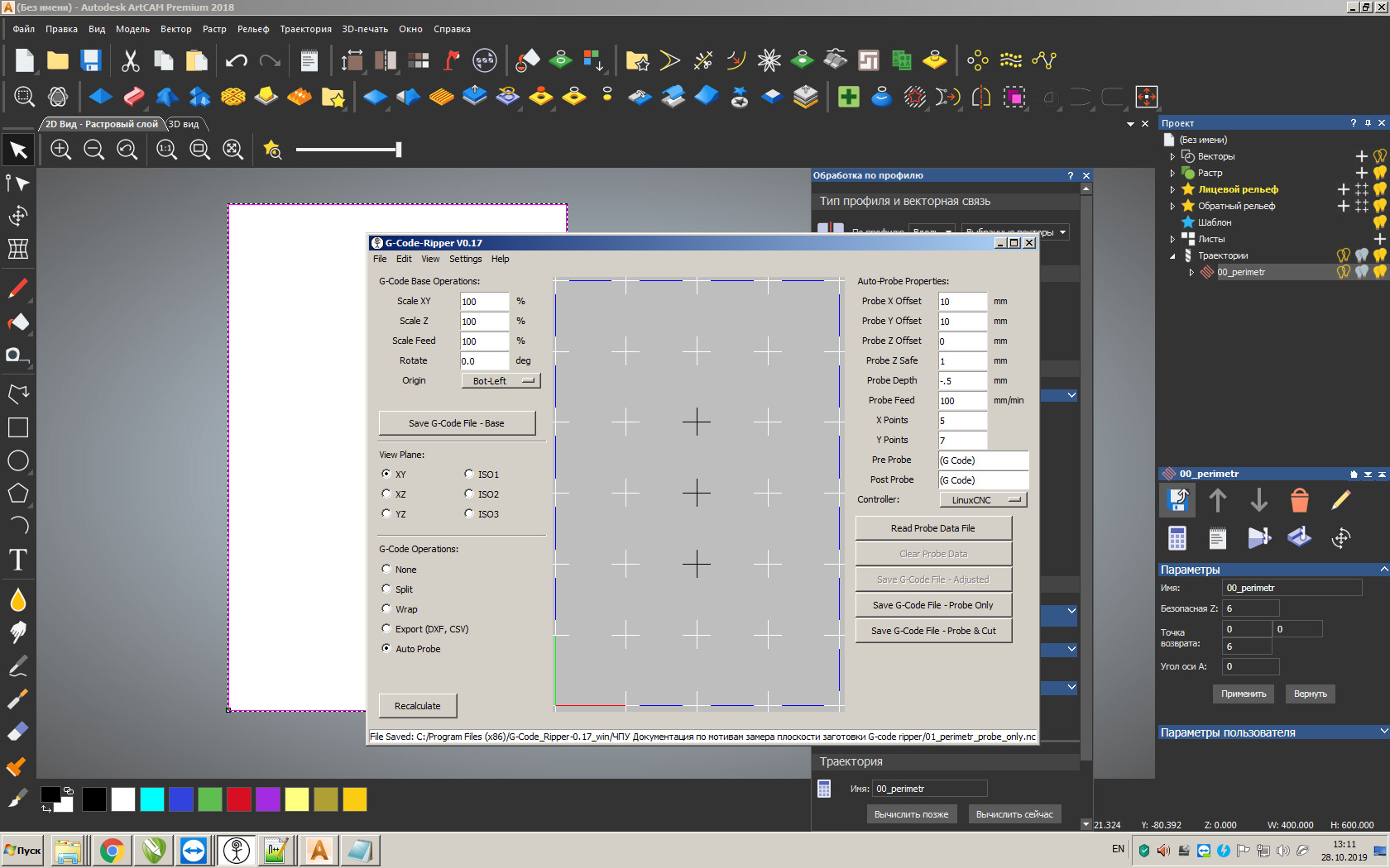 Сохранить траекторию обработки периметра в файл с названием, например, 00_perimetr.nc