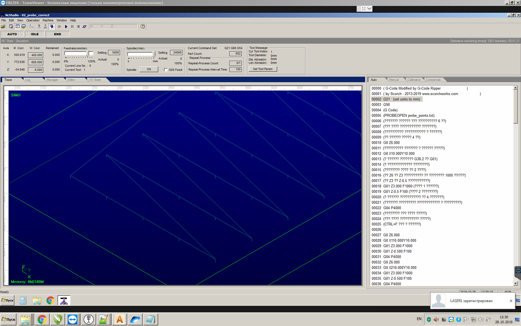 Исходный G код пересчитан с учётом данных измерений.