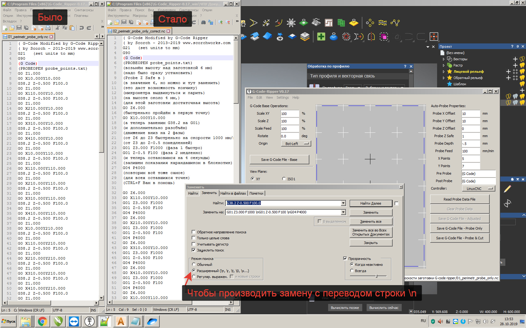 Но нам G38.2 и не нужен. Заменю его на G01 и еще кое что поправлю для удобства.