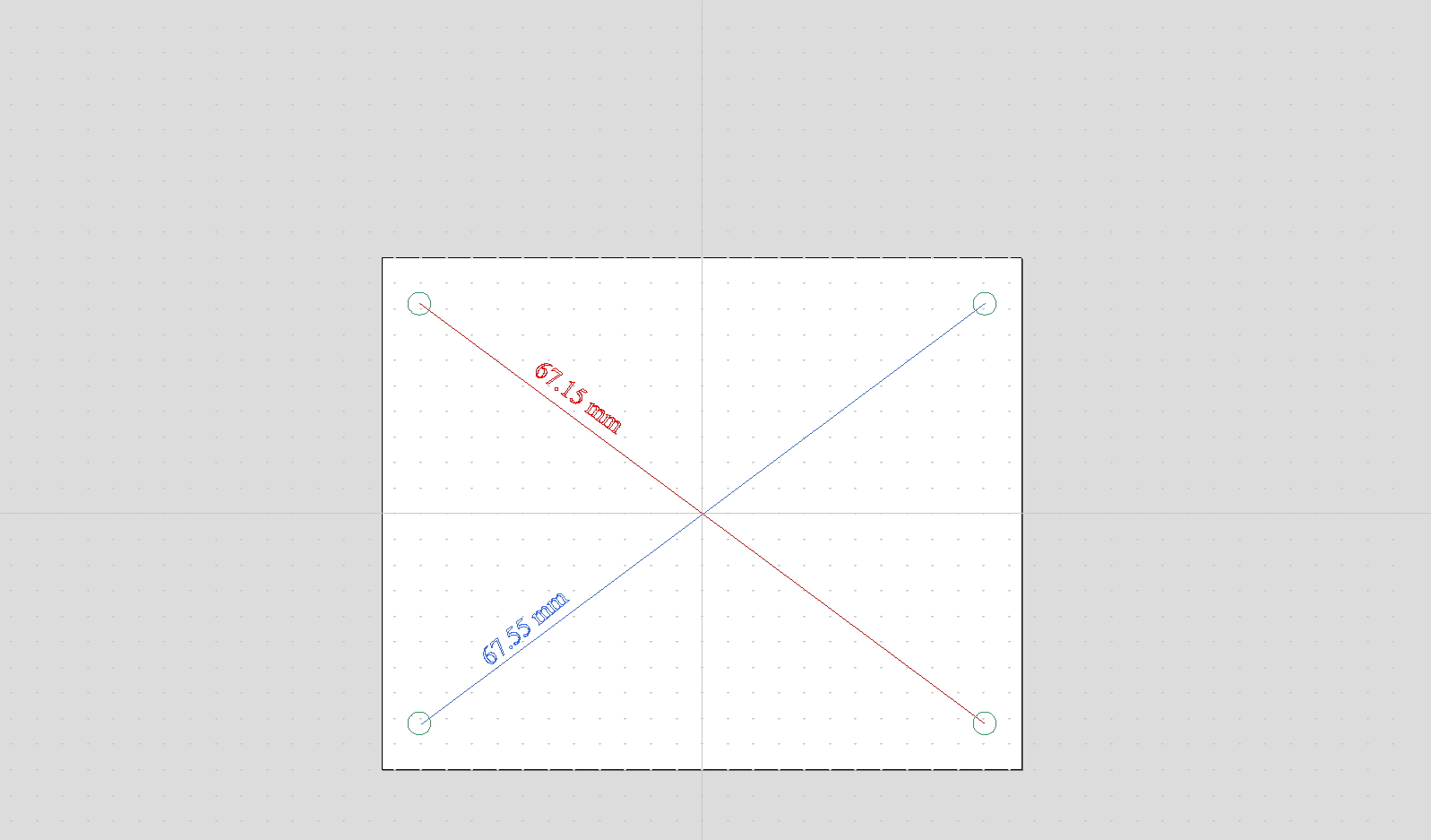 На поле : Х500 У450, сделал 4 отверстия 1мм. Первая диагональ 67.15, вторая диагональ 67.6.