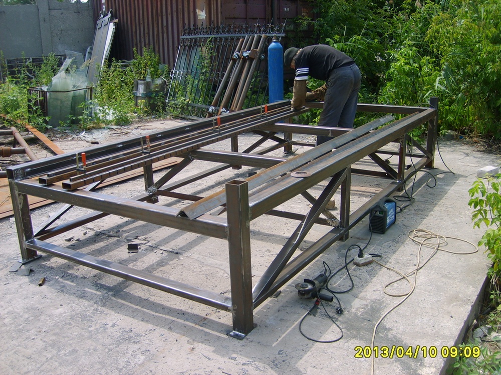- рама полностью сварная, достаточно прочная вес 200-300 кг выдержит.