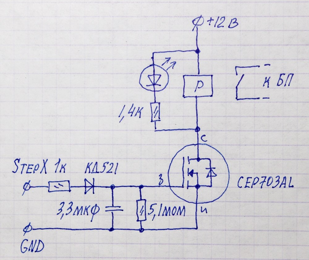 При отсутствии импульсов stepX в течении определенного времени (подбором 3.3мкф или 5.1Мом), выключается питание. Схему предлагали для использования на нихромовых выжигателях.